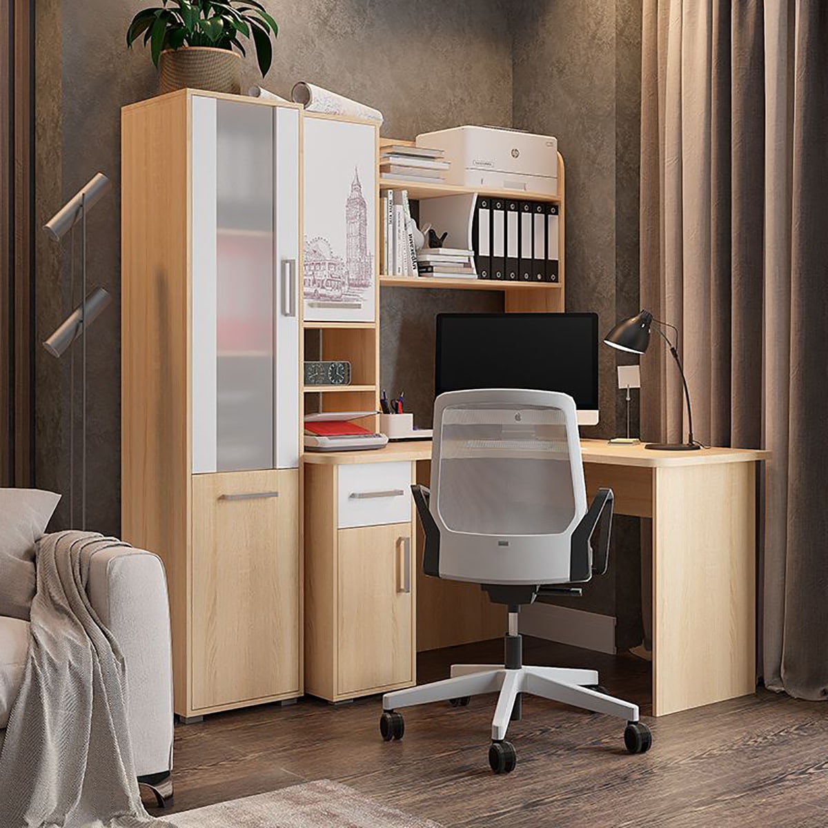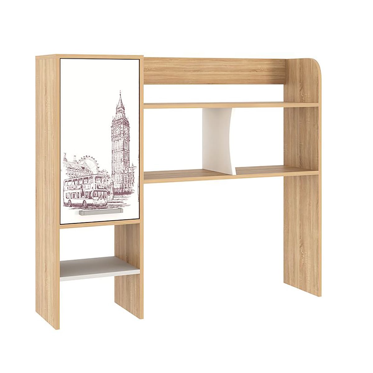 Данная надстройка оборудована вместительными полками, предназначенными для хранения книг, учебников, папок и другой необходимой документации. Также на этих полках можно разместить офисную технику, такую как сканер или принтер. Особенностью дизайна является фасад закрытой ниши с оригинальным принтерным рисунком.