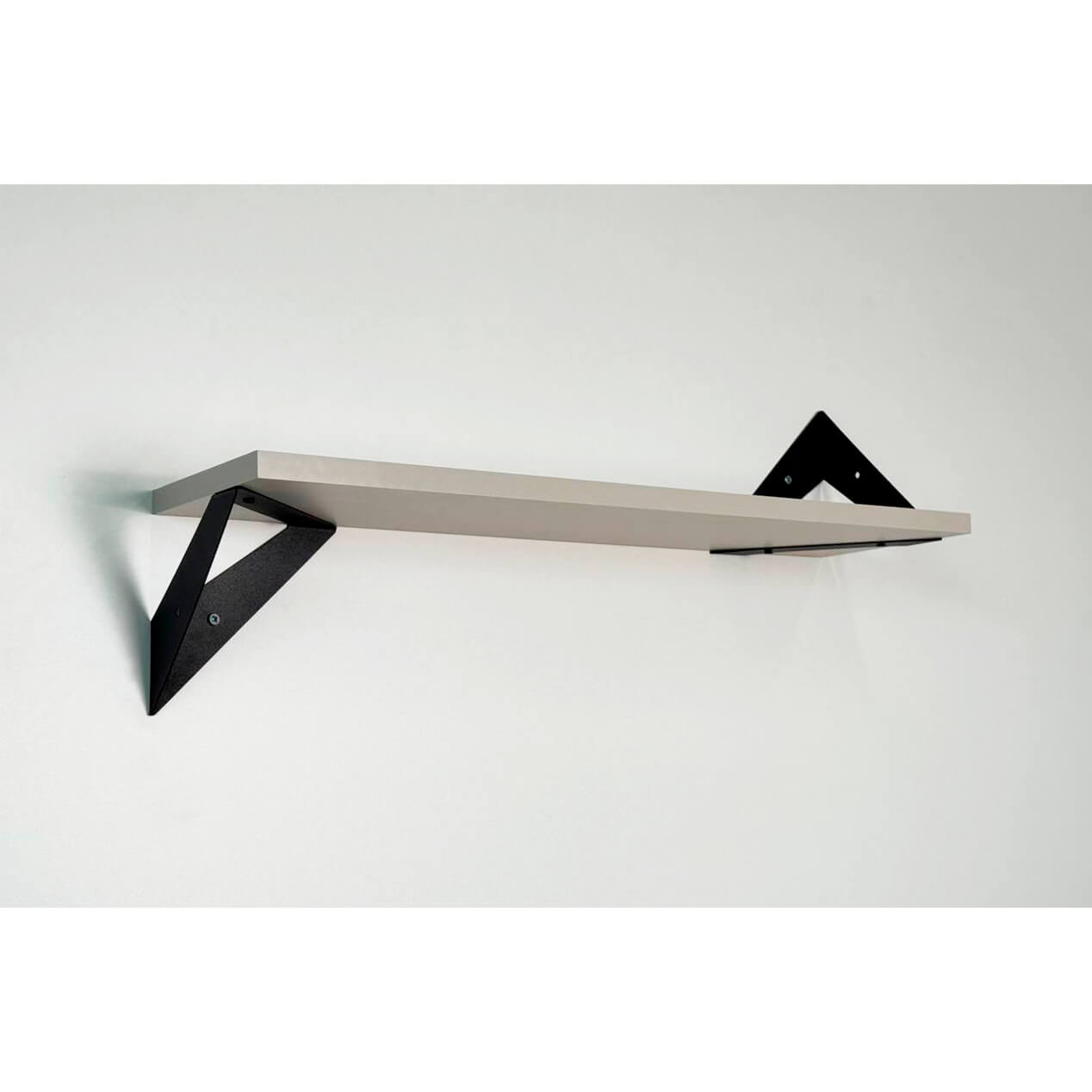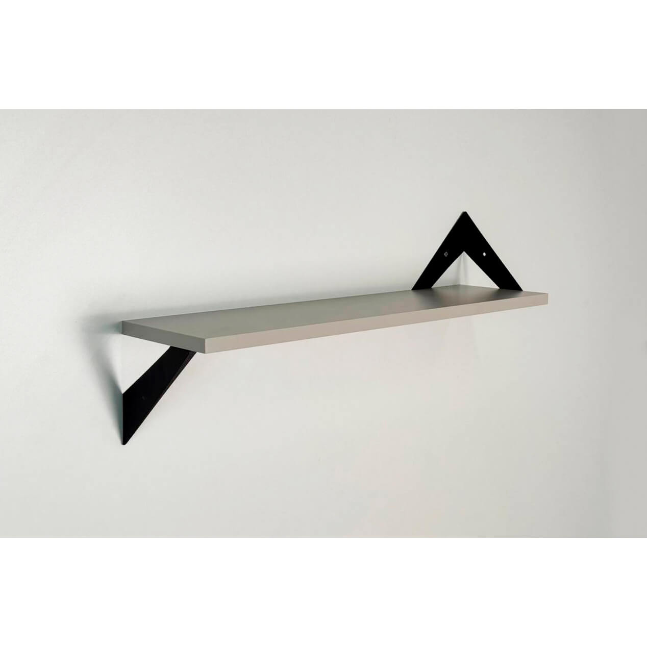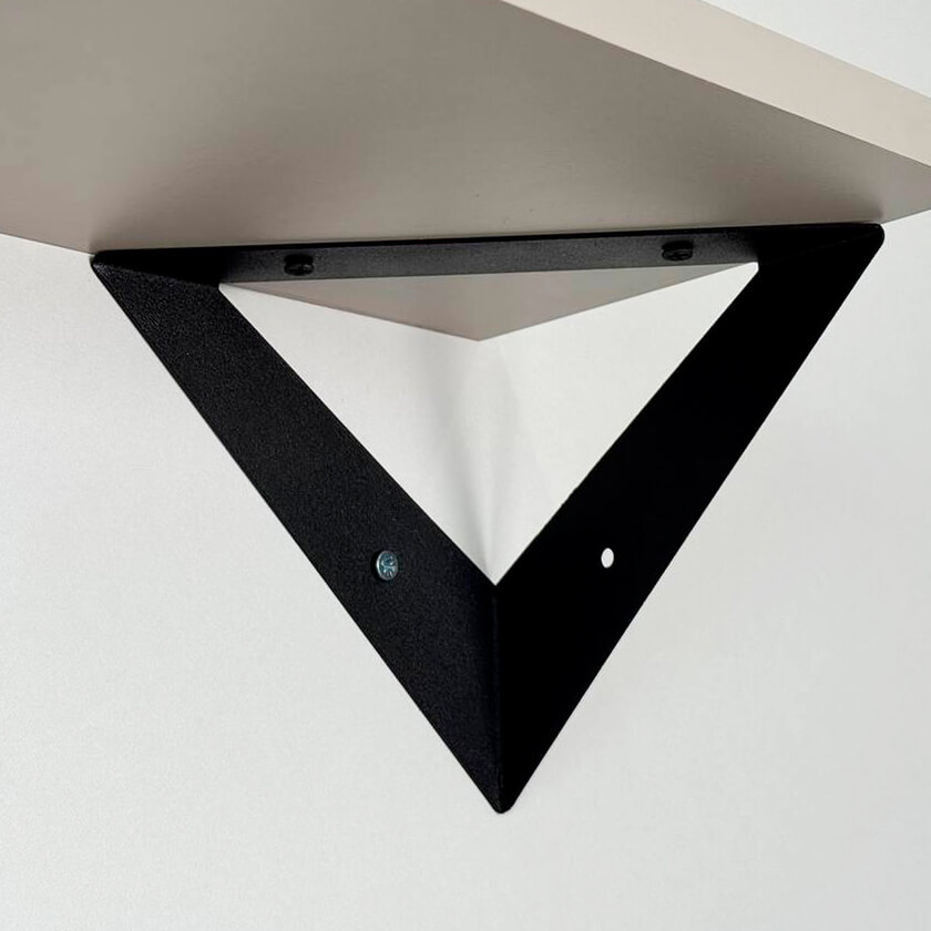 Полка крепится к стене с помощью чёрных треугольных держателей, которые обеспечивают устойчивость и долговечность. Особенность модели в том, что держатели можно расположить сверху, снизу или один сверху, другой снизу, что позволяет адаптировать полку под любые интерьерные решения и потребности.