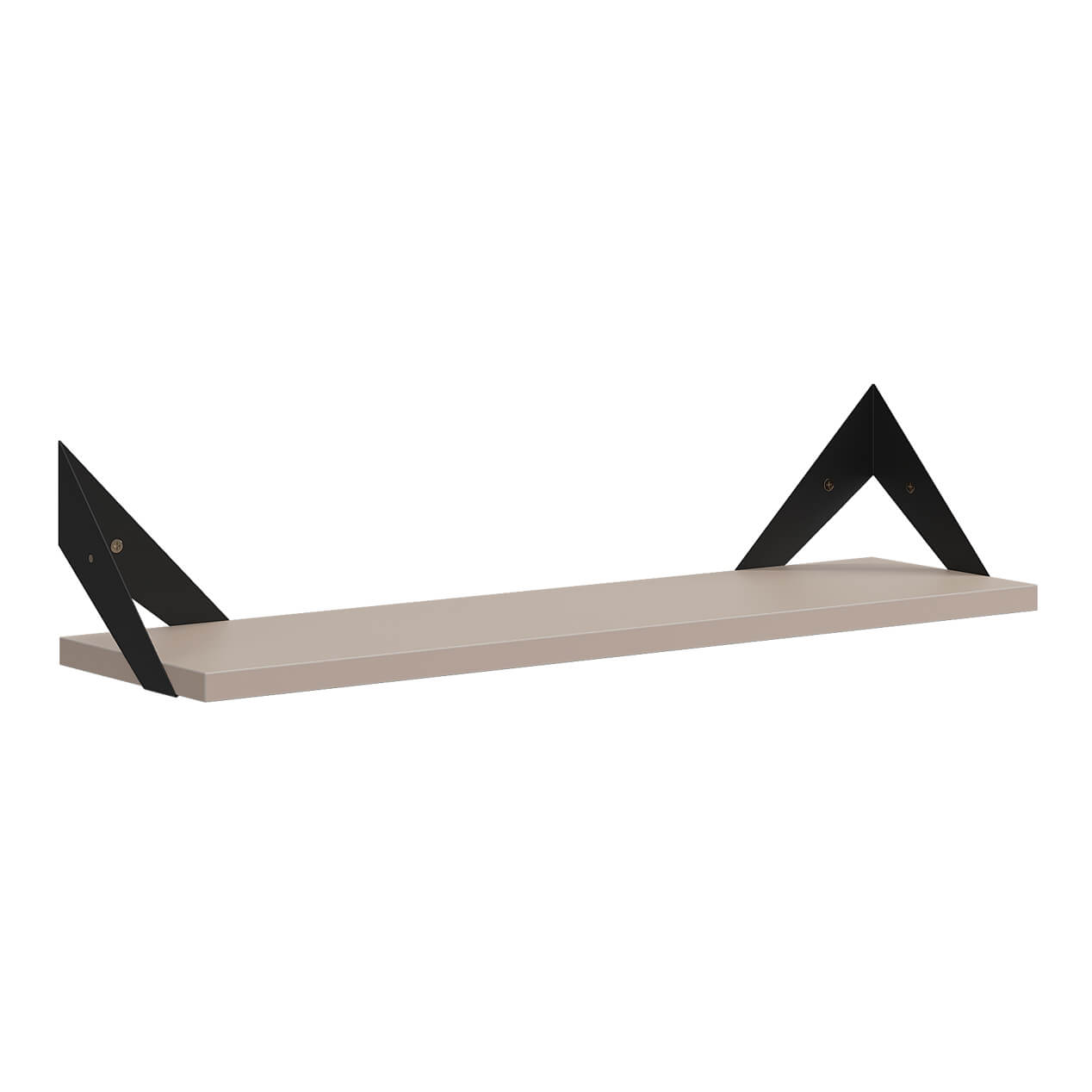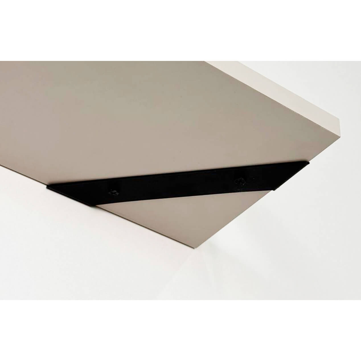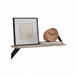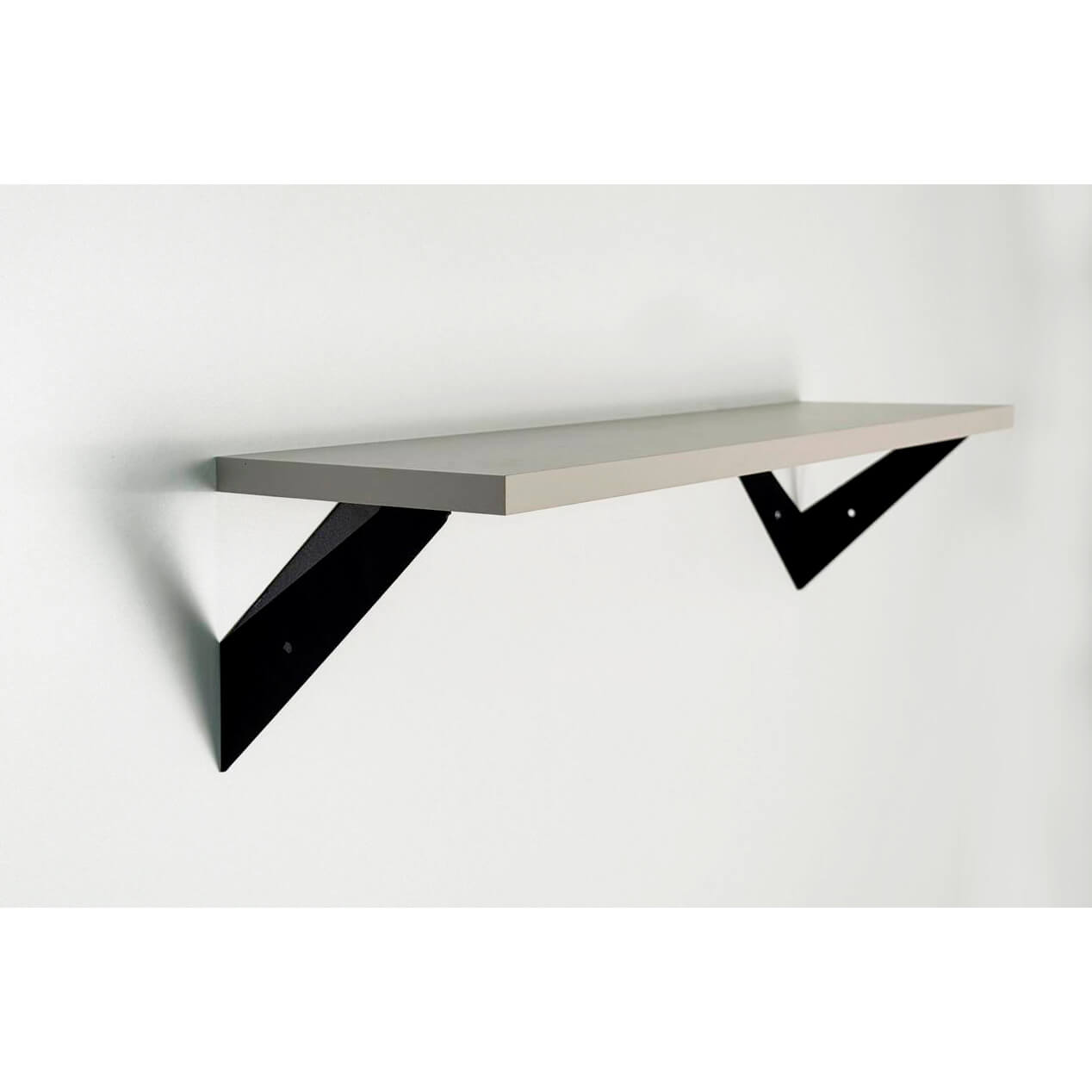 Полка крепится к стене с помощью чёрных треугольных держателей, которые обеспечивают устойчивость и долговечность. Особенность модели в том, что держатели можно расположить сверху, снизу или один сверху, другой снизу, что позволяет адаптировать полку под любые интерьерные решения и потребности.