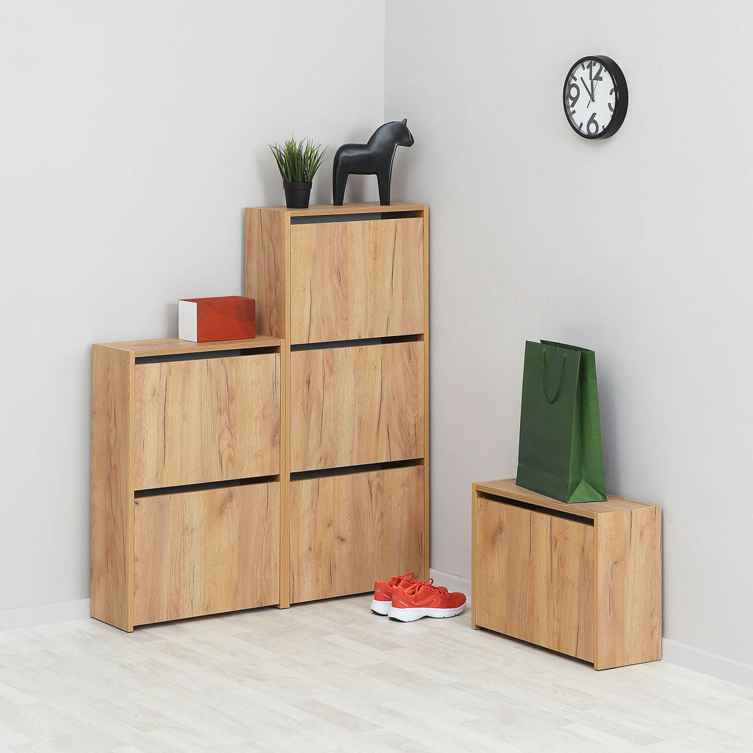 Обувница №3 придаст эстетичный вид прихожей, убережет вашу обувь от пыли и освободит пространство. Фасады без ручек, открываются за верхнюю часть.
