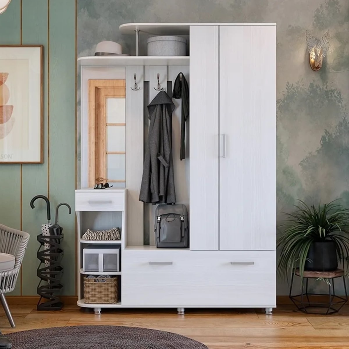 Прихожая Барселона-2: идеальное решение для максимизации пространства в вашей прихожей, объединяющее в себе все ключевые элементы для комфортного размещения одежды и аксессуаров.