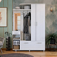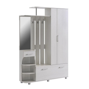 Прихожая совмещает в себе открытую вешалку с крючками для теплой верхней одежды, закрытый шкаф, удобную обувницу и специализированное место для головных уборов. К тому же, модель укомплектована панелью с зеркалом, ящиком и полками для различных мелочей, которые должны быть всегда под рукой. Дизайн фасадов украшает элегантный узор. Удобство использования дополняется регулируемыми по высоте ножками.