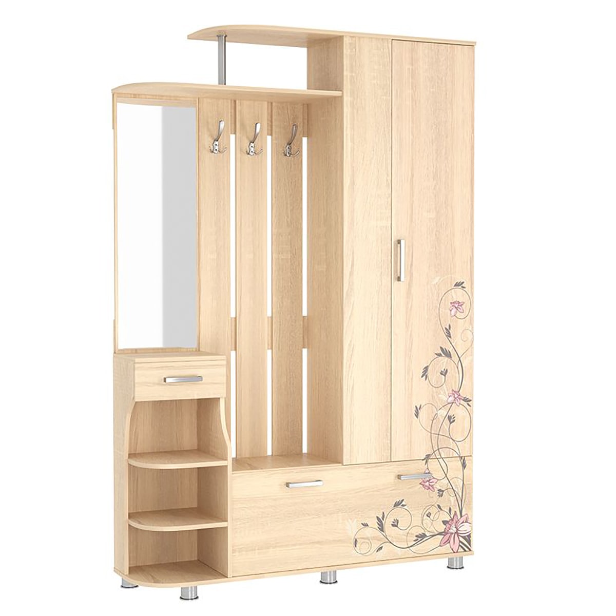 Прихожая совмещает в себе открытую вешалку с крючками для теплой верхней одежды, закрытый шкаф, удобную обувницу и специализированное место для головных уборов. К тому же, модель укомплектована панелью с зеркалом, ящиком и полками для различных мелочей, которые должны быть всегда под рукой. Дизайн фасадов украшает элегантный узор. Удобство использования дополняется регулируемыми по высоте ножками.