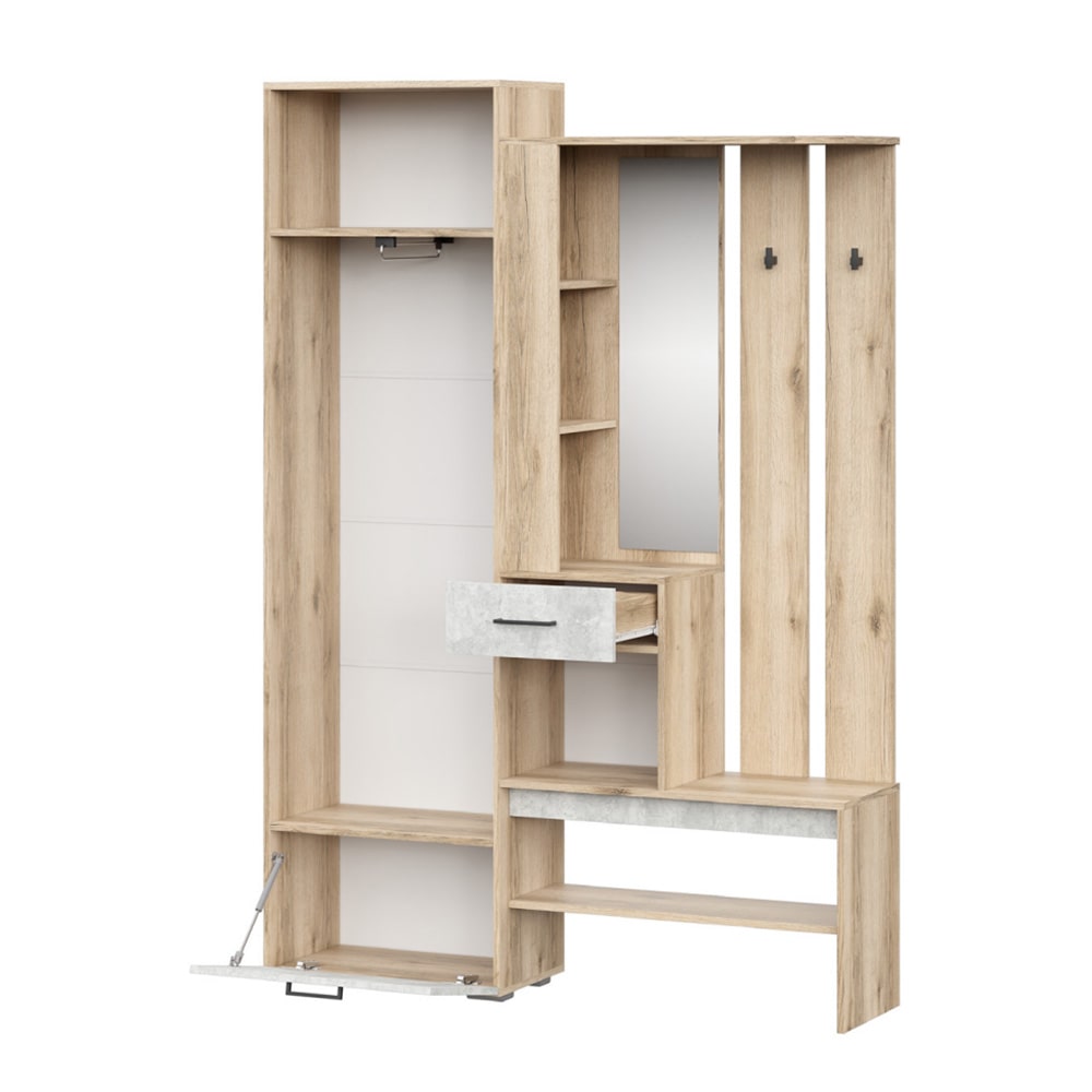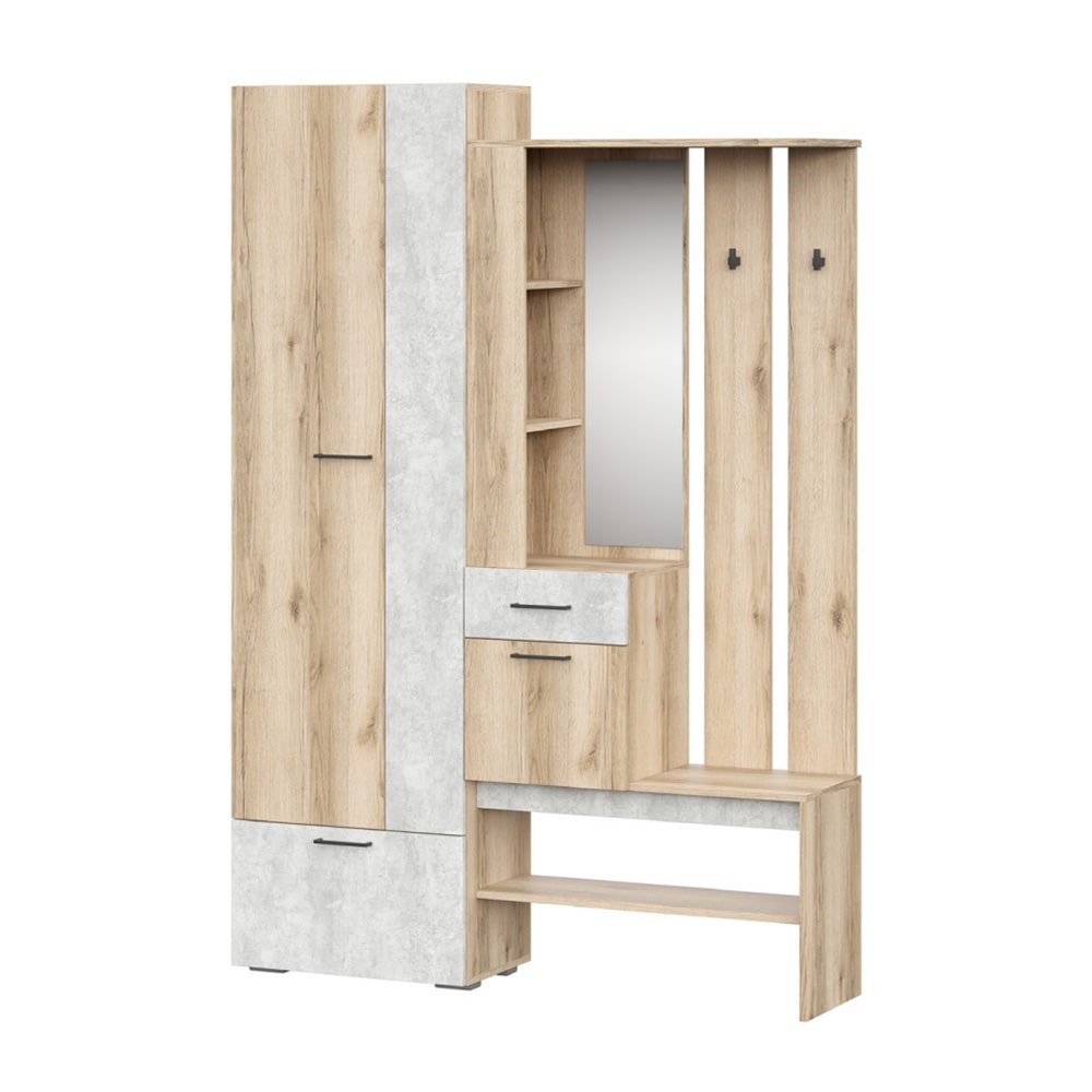 Изделие идеально впишется даже в малогабаритную прихожую, при этом включает в себя все необходимое:вместительный шкаф с выдвижной штангой, зеркало, тумба с выдвижным ящиком и распашной створкой, вешалка с крючками для одежды, полки для головных уборов и для обуви.