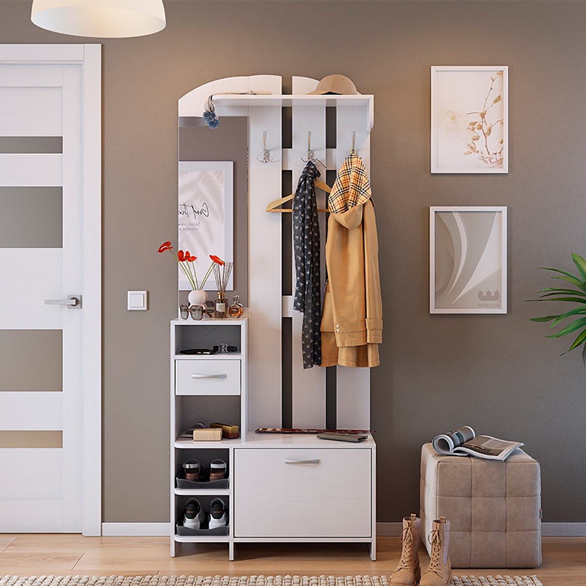 Прихожая Мила идеально подходит для тех, кто ценит компактность, но при этом хочет максимально эффективно использовать пространство. Она обеспечивает удобное размещение одежды, обуви и аксессуаров.