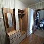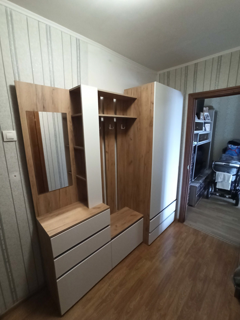 Модуль для прихожей представляет собой вешалку из трех планок ЛДСП с установленными на них 2х рожковыми крючками с полками для головных уборов, тумбу-обувницу с закрытыми отсекоми для хранения с распашной створкой и ящикоми для мелочей на шариковых направляющих. На тумбе установлено зеркало, под вешалкой есть место хранения стеллажного типа. Фасады накладные.