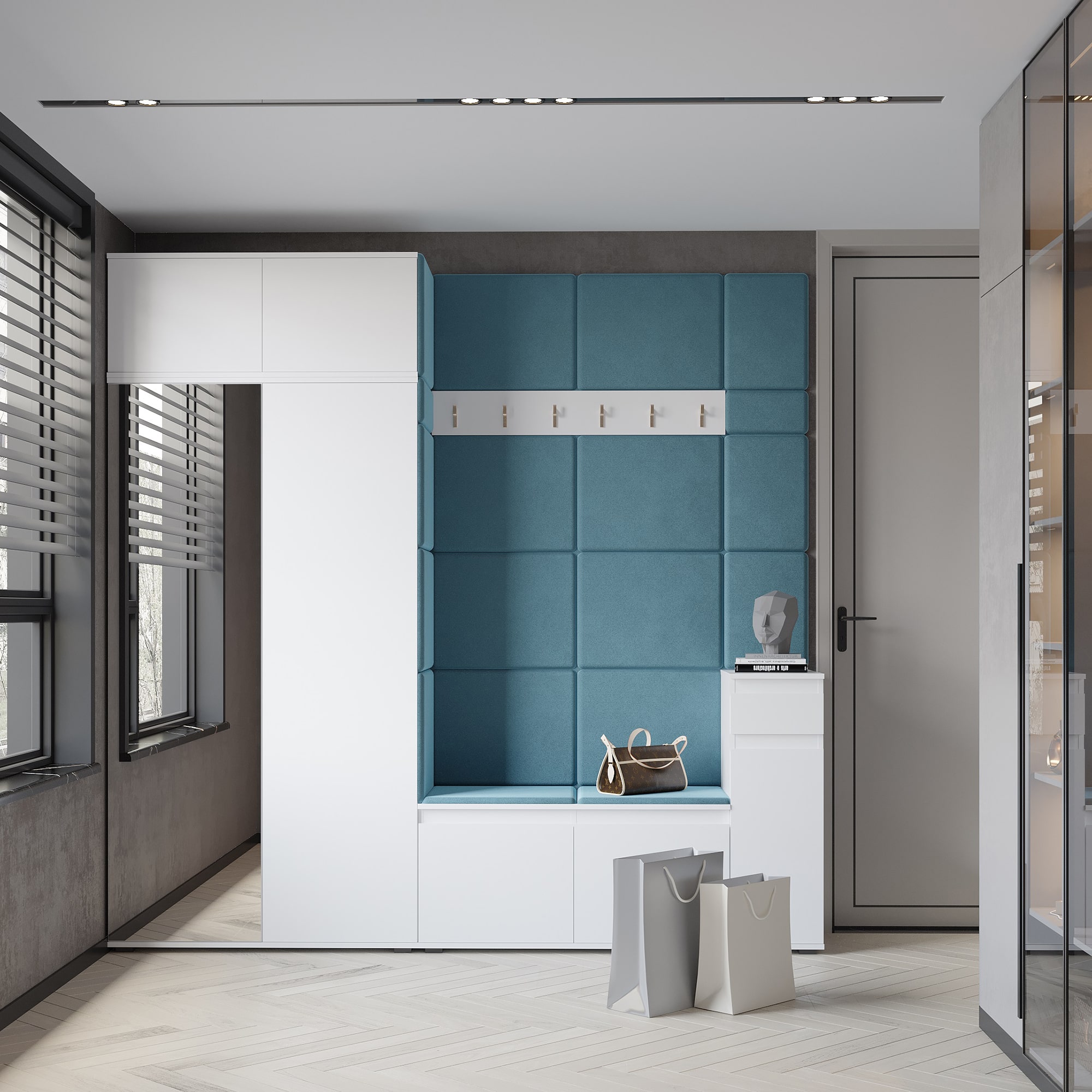 Главной фишкой прихожей, являются декоративные мягкие панели, для отделки боковин и стен, которые позволят украсить минималистичный интерьер прихожей и придать этой зоне комфорта и стиля.