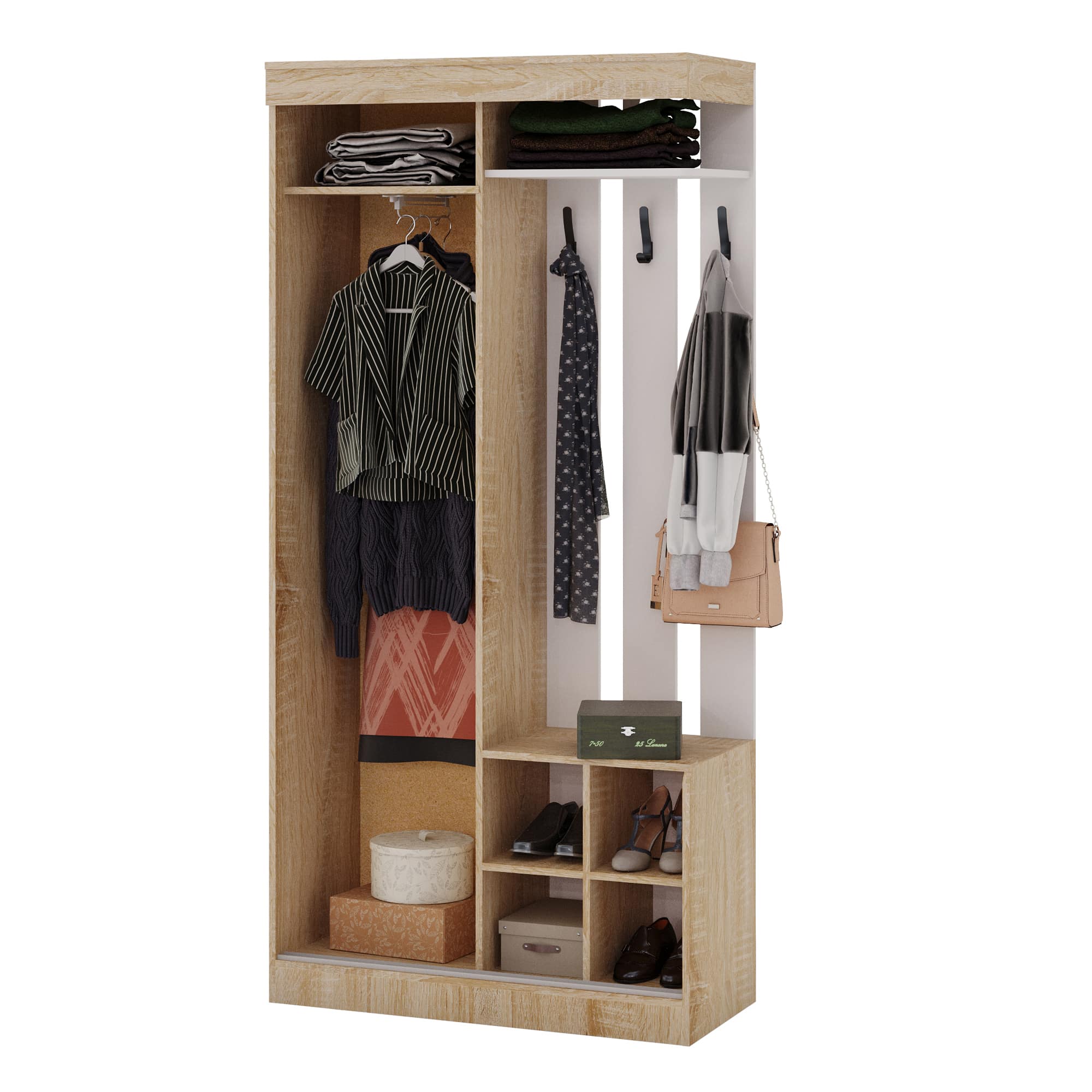 В состав прихожей входит купейный шкаф с вешалкой для верхней одежды и полками для обуви.