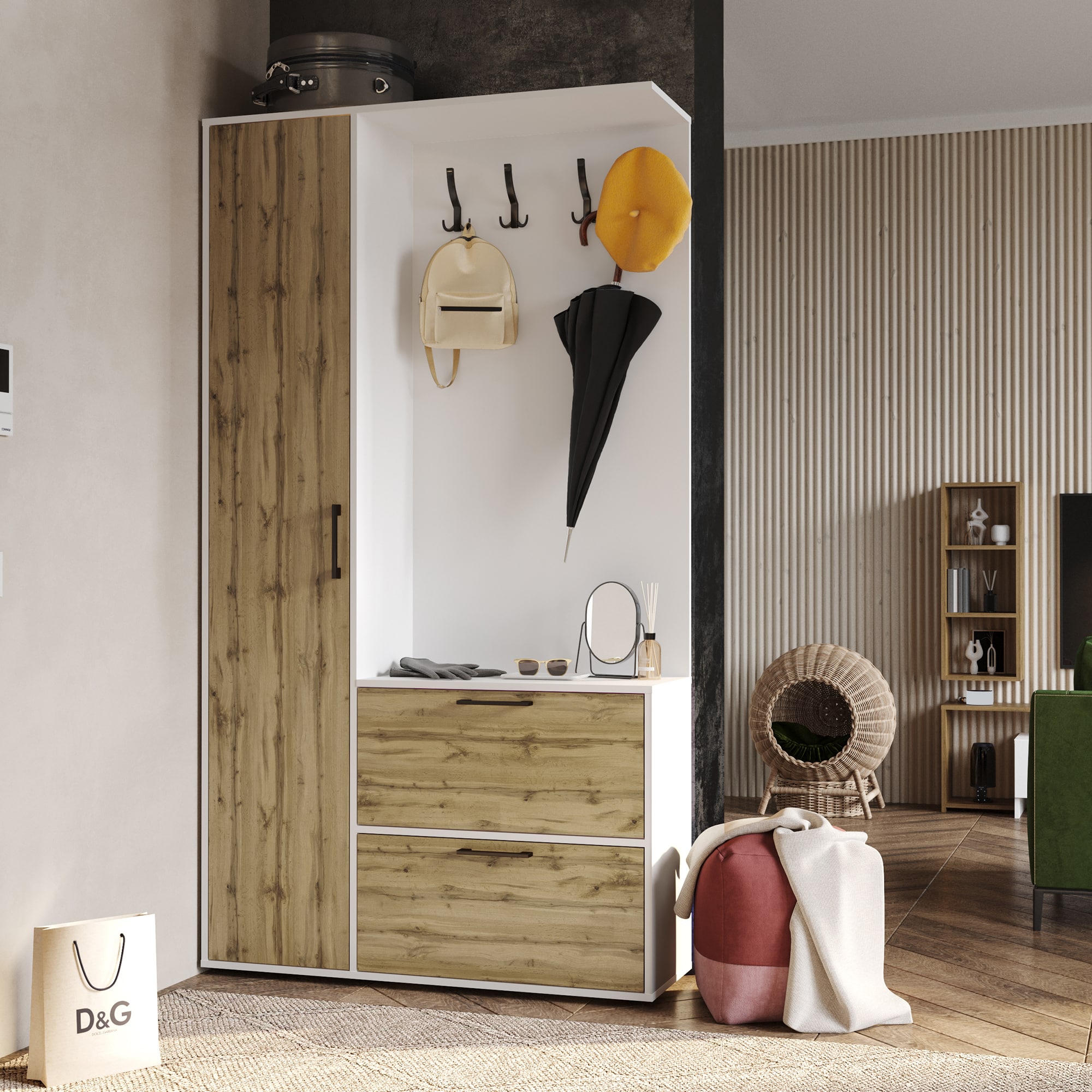 В прихожей «Сиама» есть шкаф с полками, закрытый фасадом, и тумба для обуви с двумя отсеками, также закрытыми фасадами. Над тумбой расположена панель с крючками для верхней одежды. Чёрные ручки мебели добавляют современный вид прихожей.
