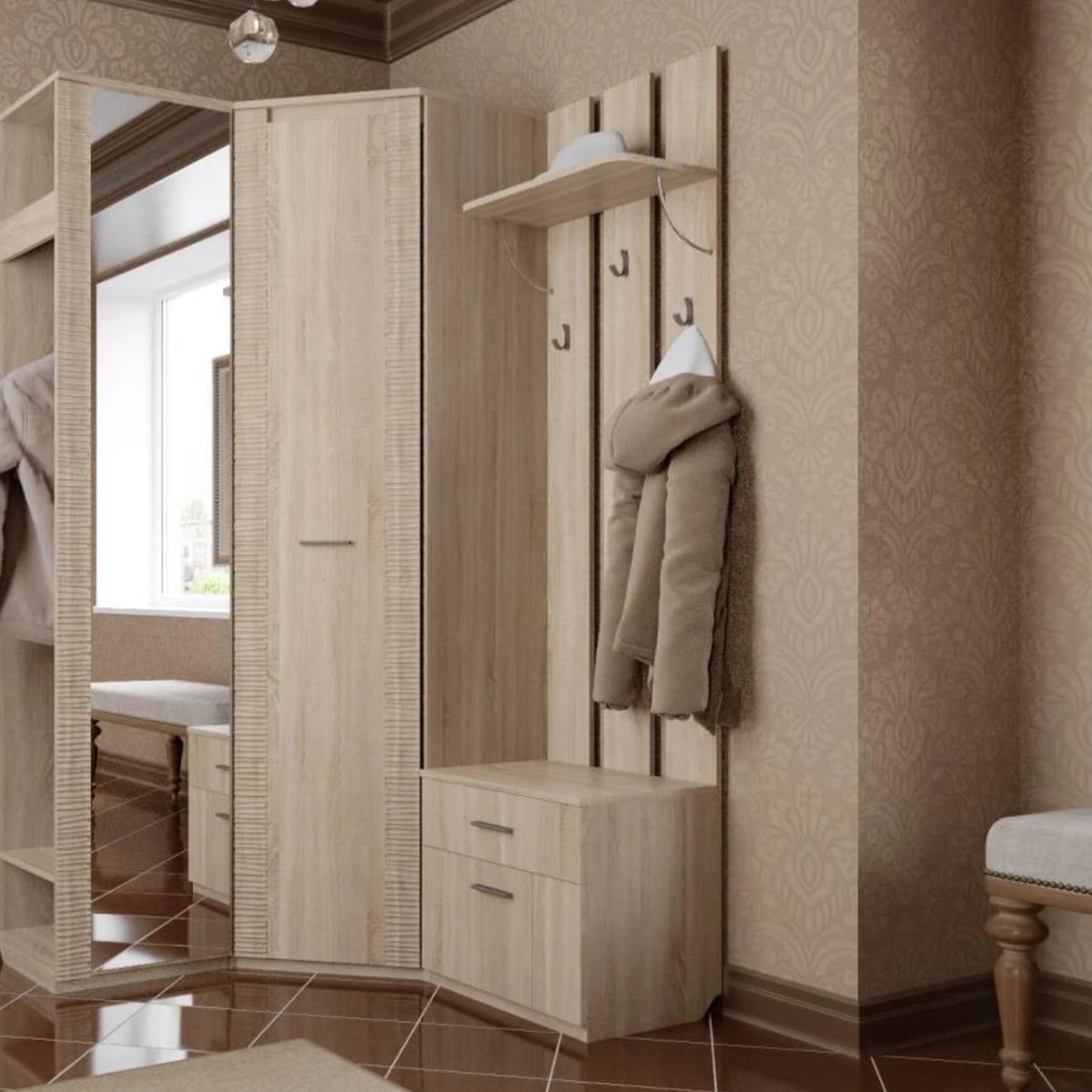 Создатели данной прихожей пошли на маленькую хитрость для экономии пространства: "Элана" имеет очень интересное угловое расположение. В закрытых и открытых шкафах, по всей длине одного из которых расположено зеркало, поместится необходимое количество одежды, обуви, головных уборов, сумок и других необходимых вещей и важных мелочей.