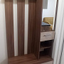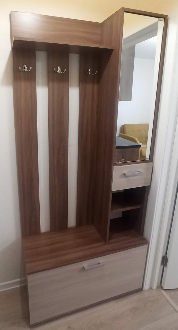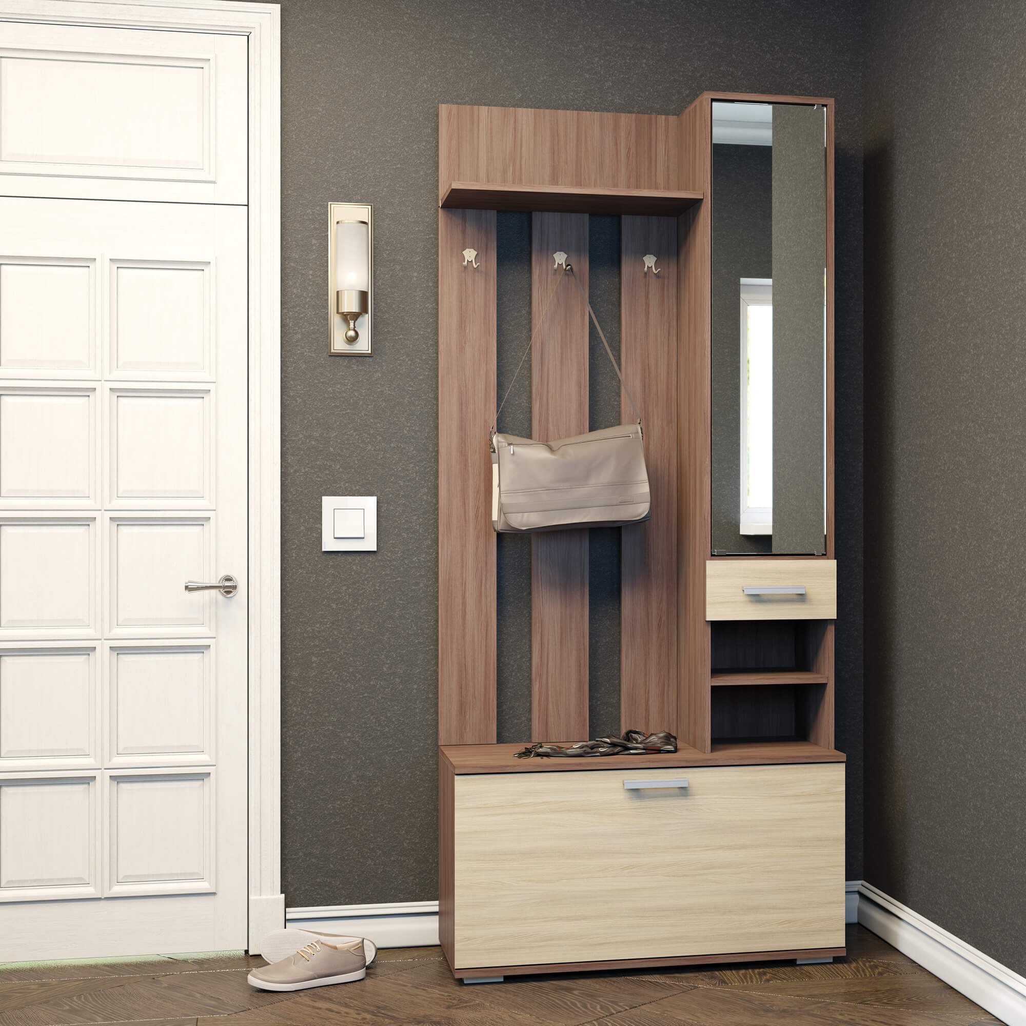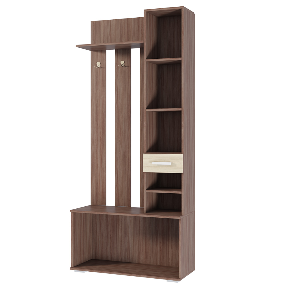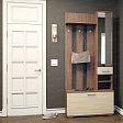 Цвет вешалки выполнен в приятных бежевых и коричневых тонах, имитирующих натуральный материал - ясень шимо. Материал фасада - ЛДСП, который не реагирует на воду, что делает его более устойчивым к влаге.