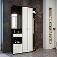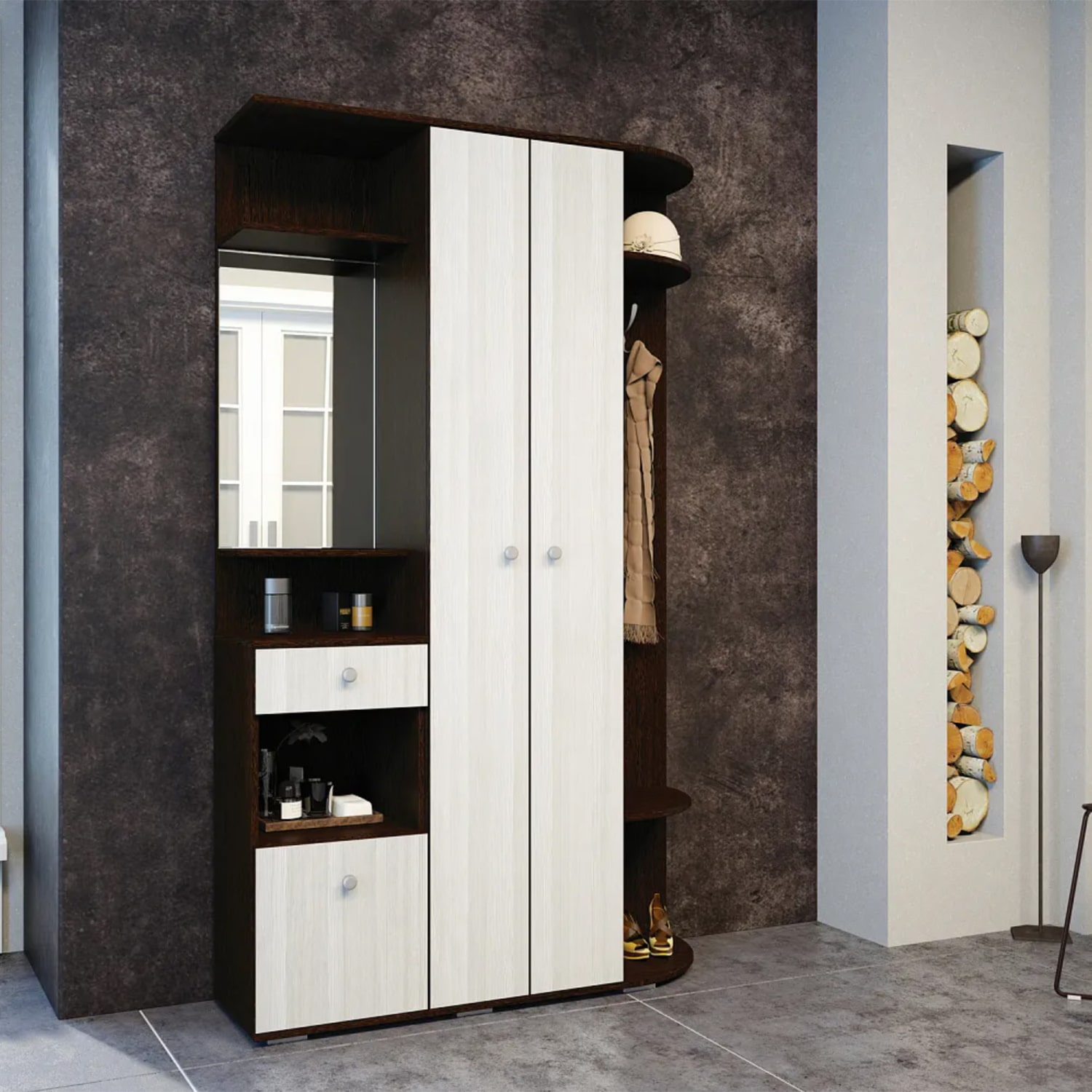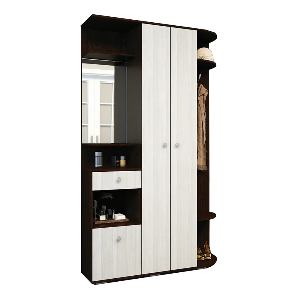 Прихожая включает в себя все необходимые элементы для комфортного использования: вешалку с крючками для одежды, зеркало, шкаф с выдвижной штангой и антресольной полкой, а также выдвижной ящик и тумбу.