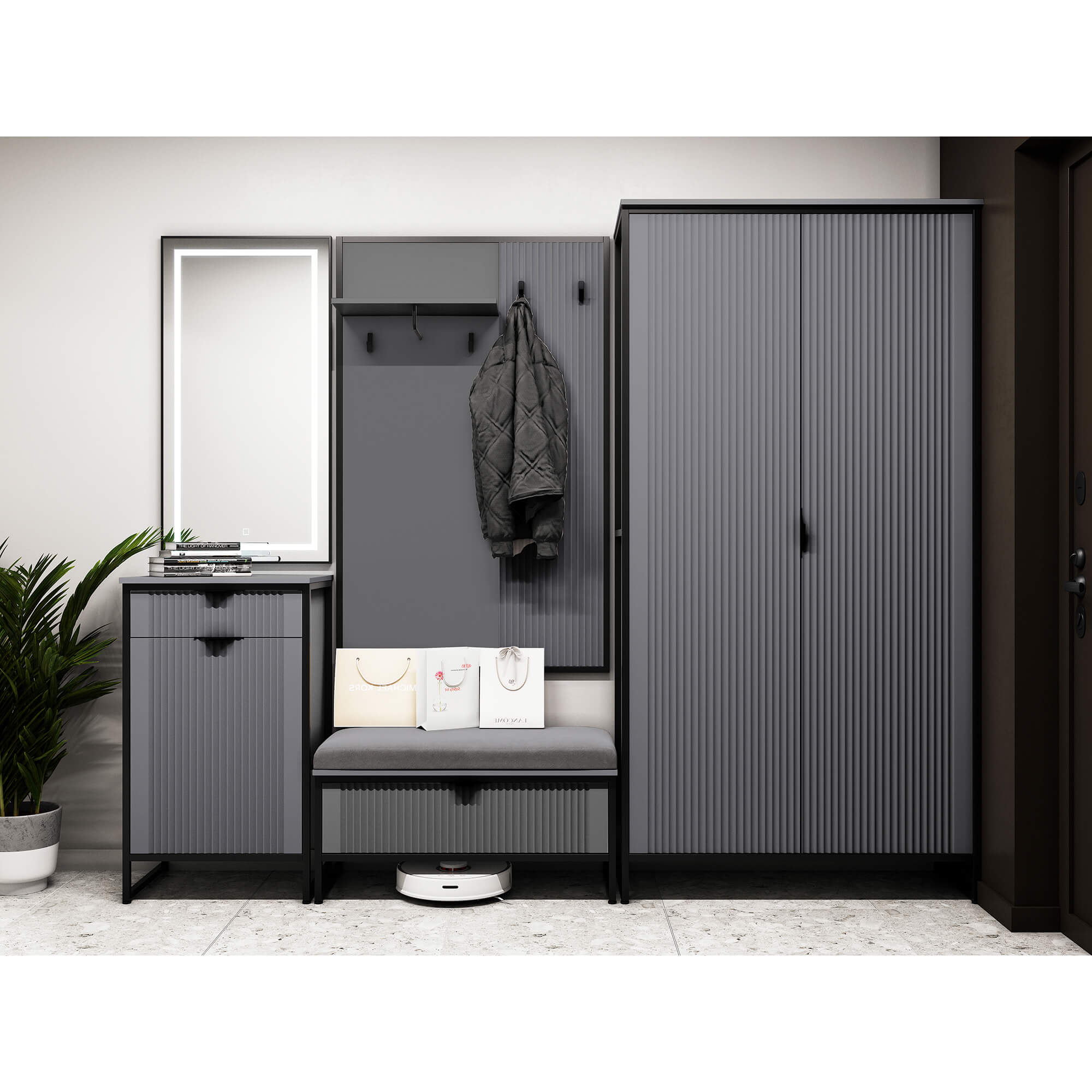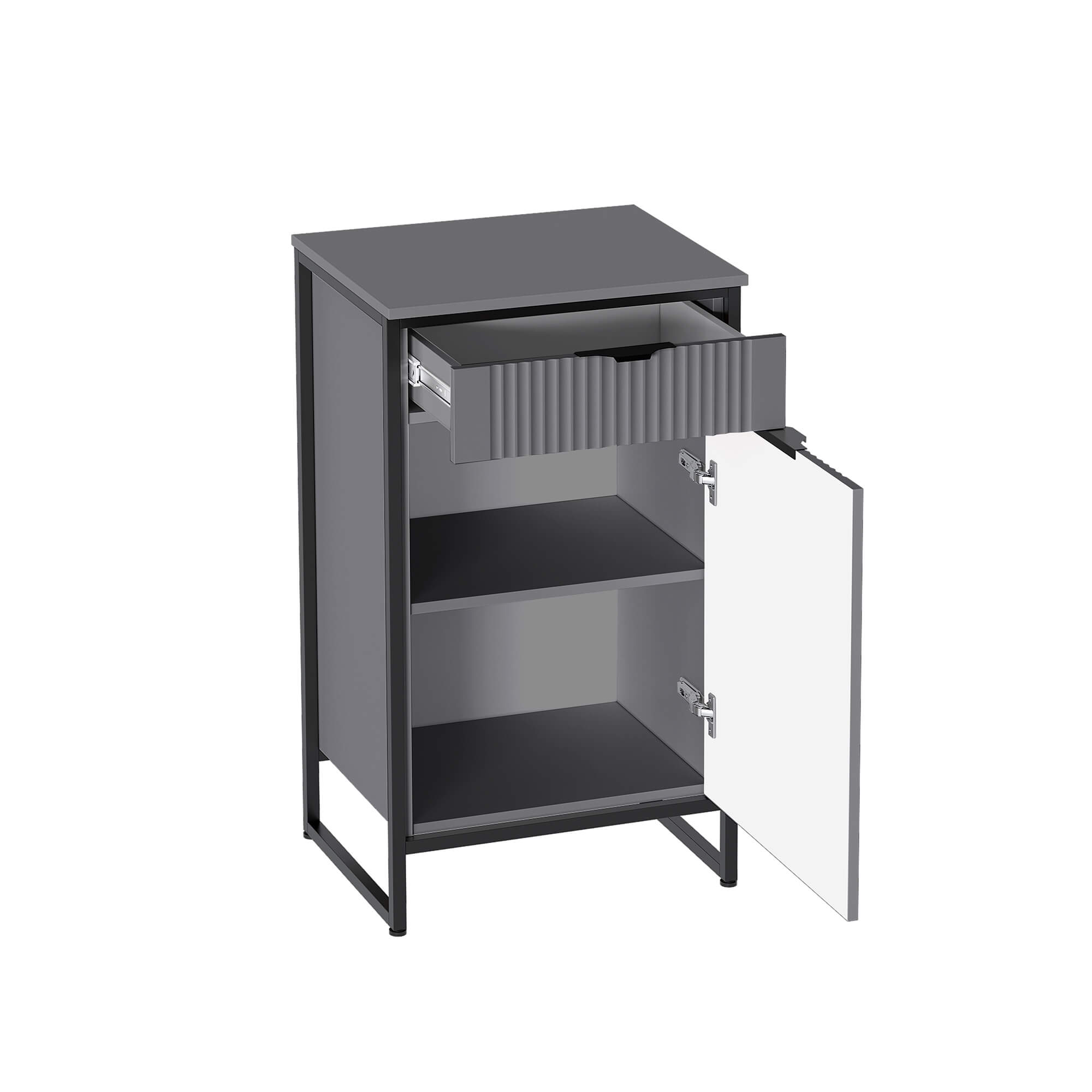 В верхней части тумбы установлен выдвижной ящик на шариковых направляющих с доводчиками. Нижняя часть тумбы закрыта распашной дверью, за которой установлена съёмная полка. Дверь может устанавливаться, как на правую, так и на левую сторону и оснащена петлями с доводчиками.