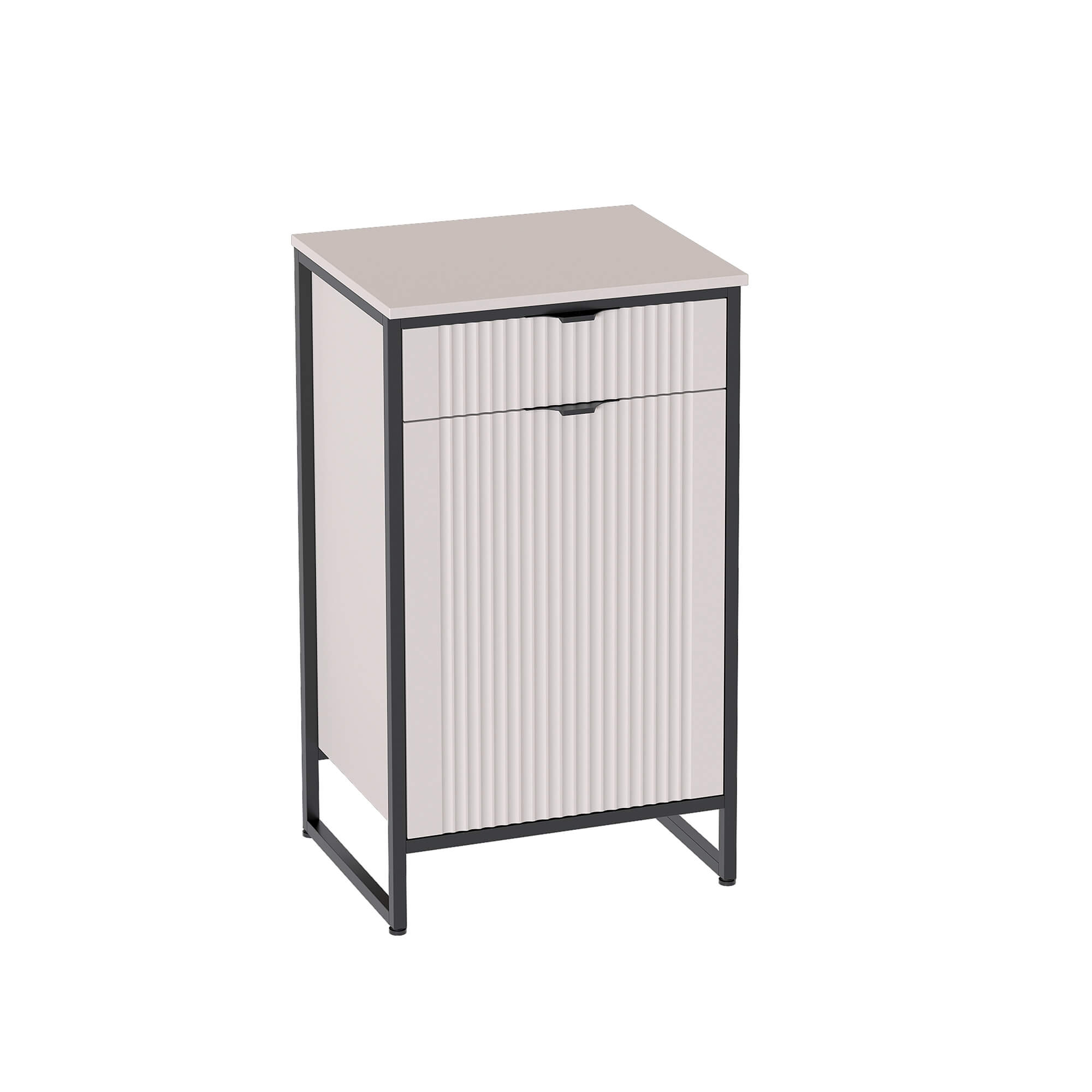 В верхней части тумбы установлен выдвижной ящик на шариковых направляющих с доводчиками. Нижняя часть тумбы закрыта распашной дверью, за которой установлена съёмная полка. Дверь может устанавливаться, как на правую, так и на левую сторону и оснащена петлями с доводчиками.
