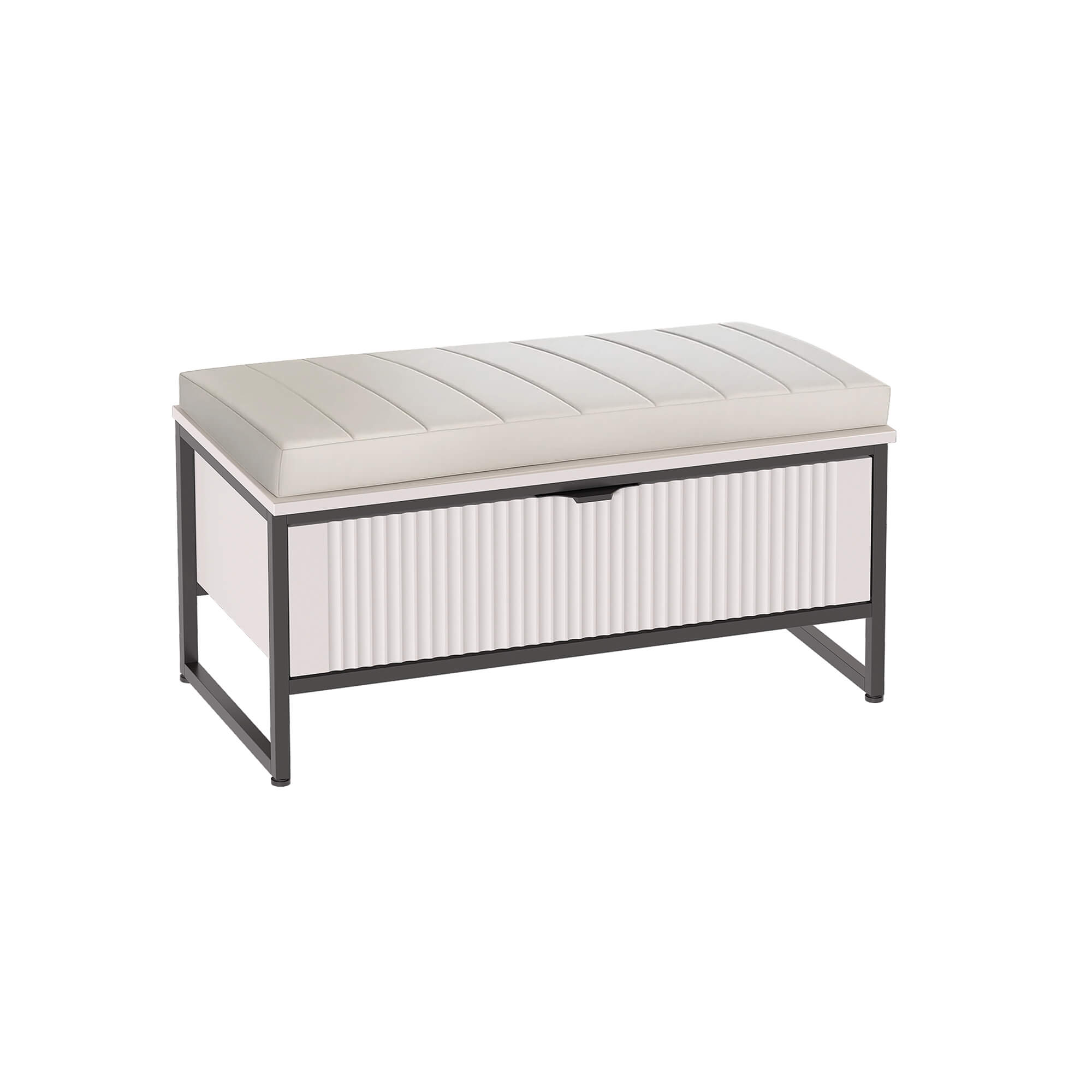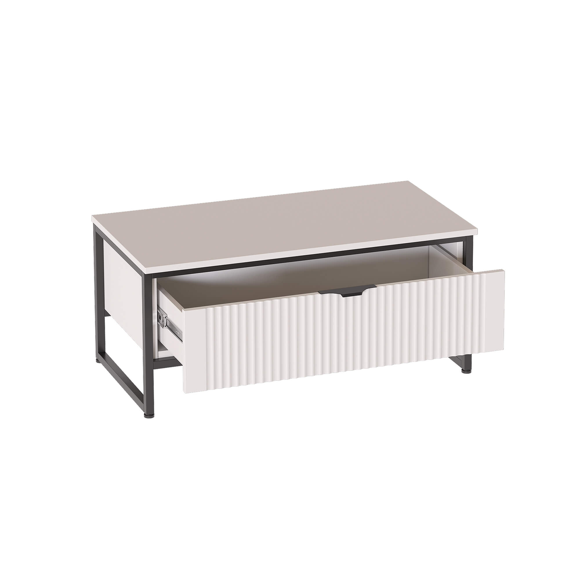 Тумба состоит из несущего металлического каркаса и закрепленного к нему корпуса из ЛДСП, внутри которого установлен выдвижной ящик на шариковых направляющих с доводчиками.