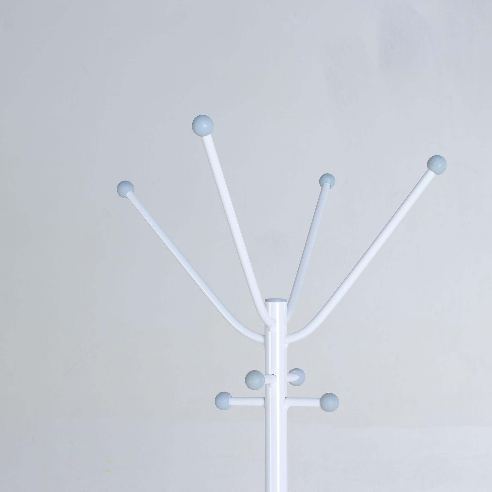 Классическая напольная офисная вешалка с четырьмя крючками для верхней одежды и столько же для головных уборов.