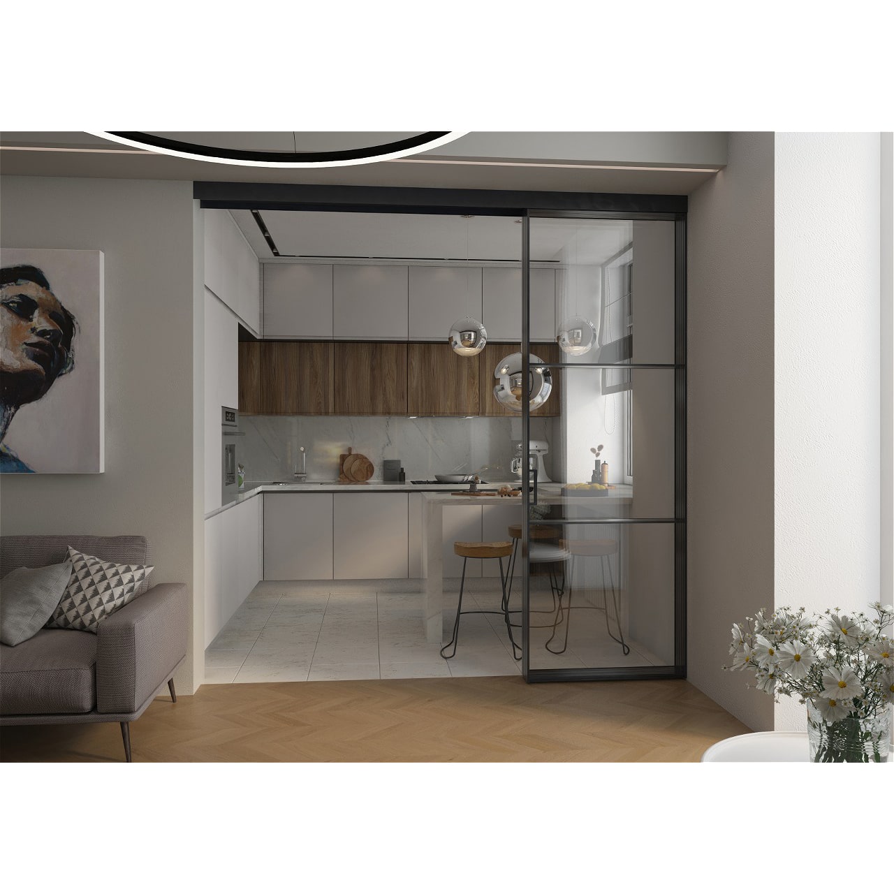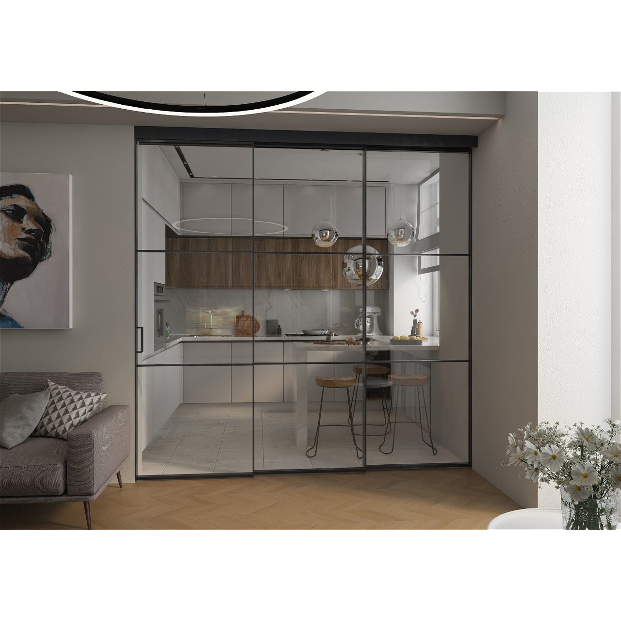Подвесные двери синхронно-последовательного открывания без нижней направляющей сдвигаются в одну сторону, сохраняя максимум естественного освещения и широкий удобный проход из кухни в гостиную.