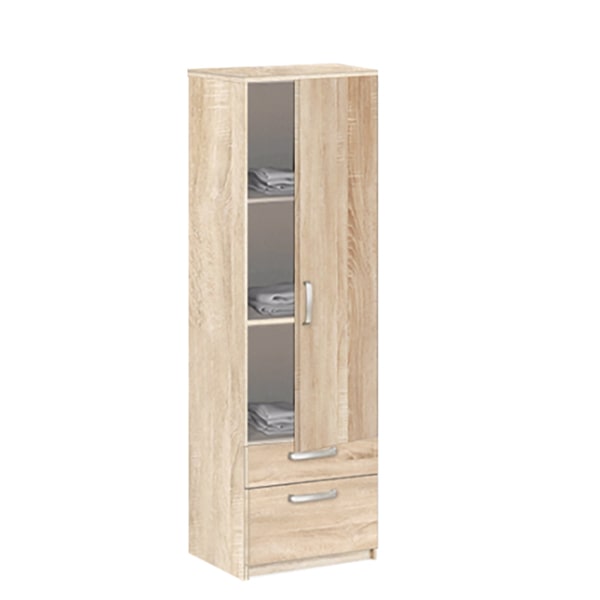 Шкаф имеет одну распашную дверь, которая открывается на себя. Внутри шкафа расположены две полки и два ящика, что обеспечивает достаточное пространство для хранения вещей.