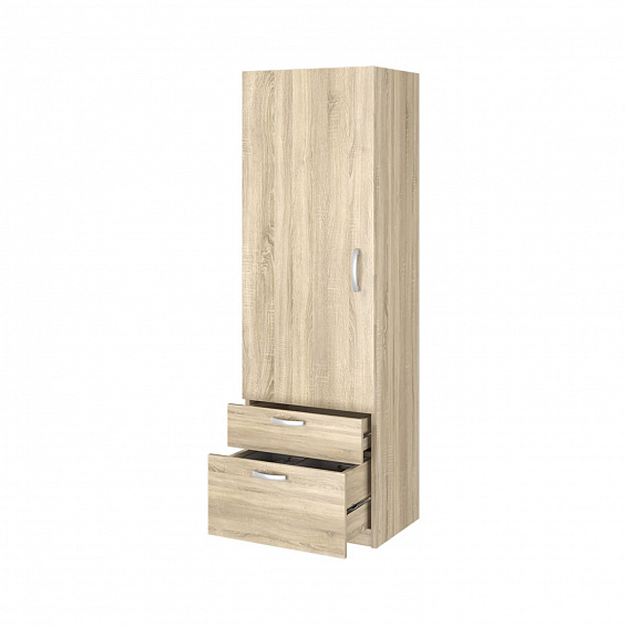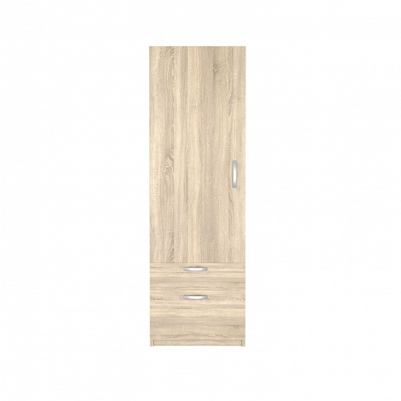 Шкаф имеет одну распашную дверь, которая открывается на себя. Внутри шкафа расположены две полки и два ящика, что обеспечивает достаточное пространство для хранения вещей.