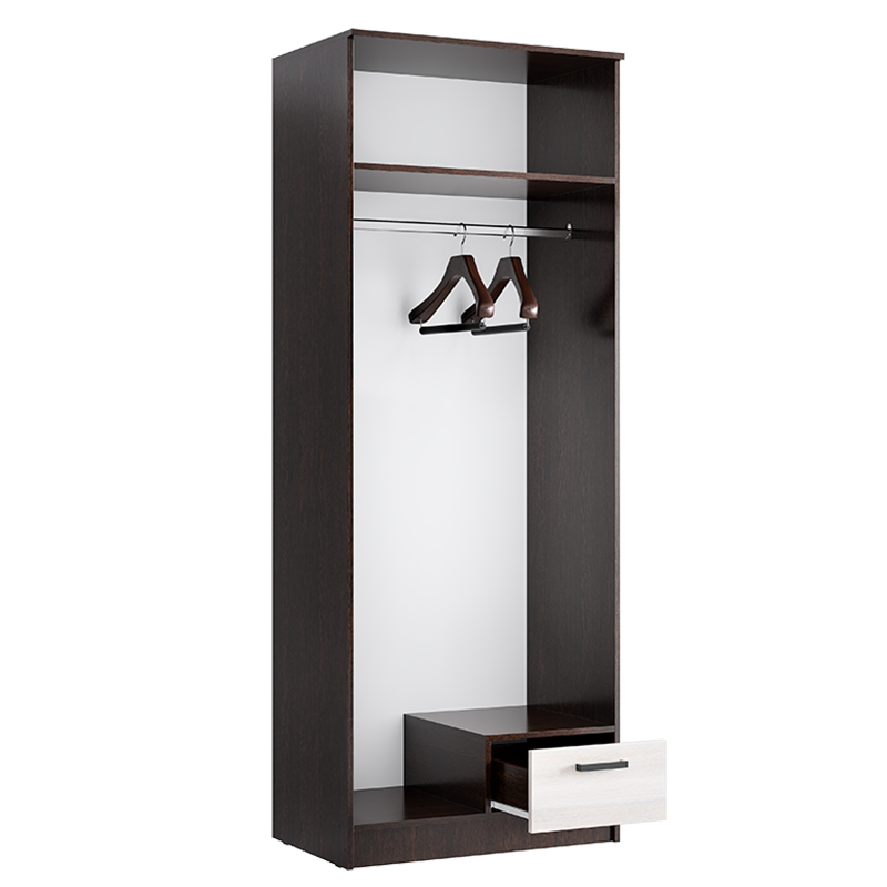 Шкаф оснащен двумя распашными дверями, за которыми расположены полка и штанга для вешалок. Это позволяет удобно разместить предметы вашего гардероба, экономя пространство и обеспечивая быстрый доступ к вещам.