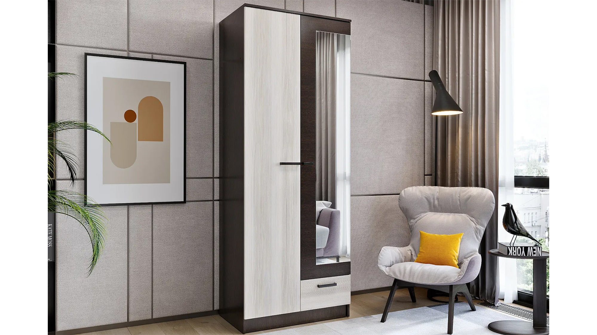 Особенностью шкафа является наличие зеркала на правой двери, что позволяет визуально увеличить пространство и сделать его более функциональным.