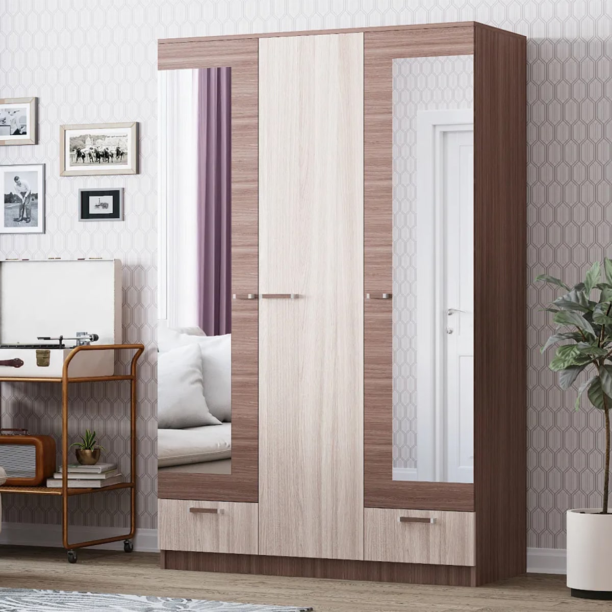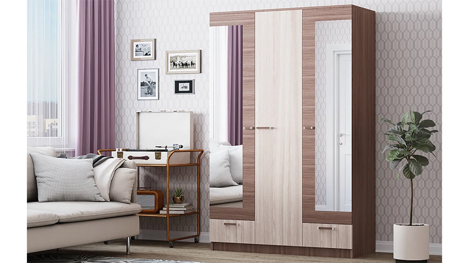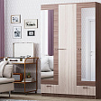 Три распашные двери шкафа обеспечивают удобное размещение предметов гардероба, а внутри шкафа находятся четыре полки и два ящика для дополнительного пространства хранения.