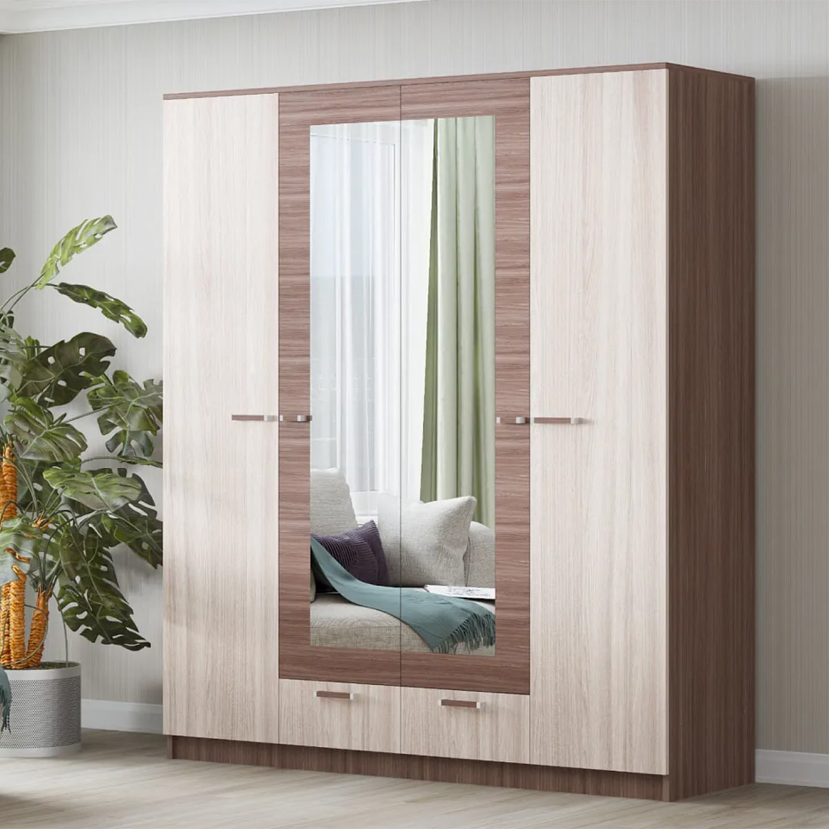 Корпус шкафа изготовлен из качественного ЛДСП, а фасады - из ЛДСП и прочного долговечного зеркала.  Зеркало, входящее в комплект, придает шкафу современный и стильный вид.