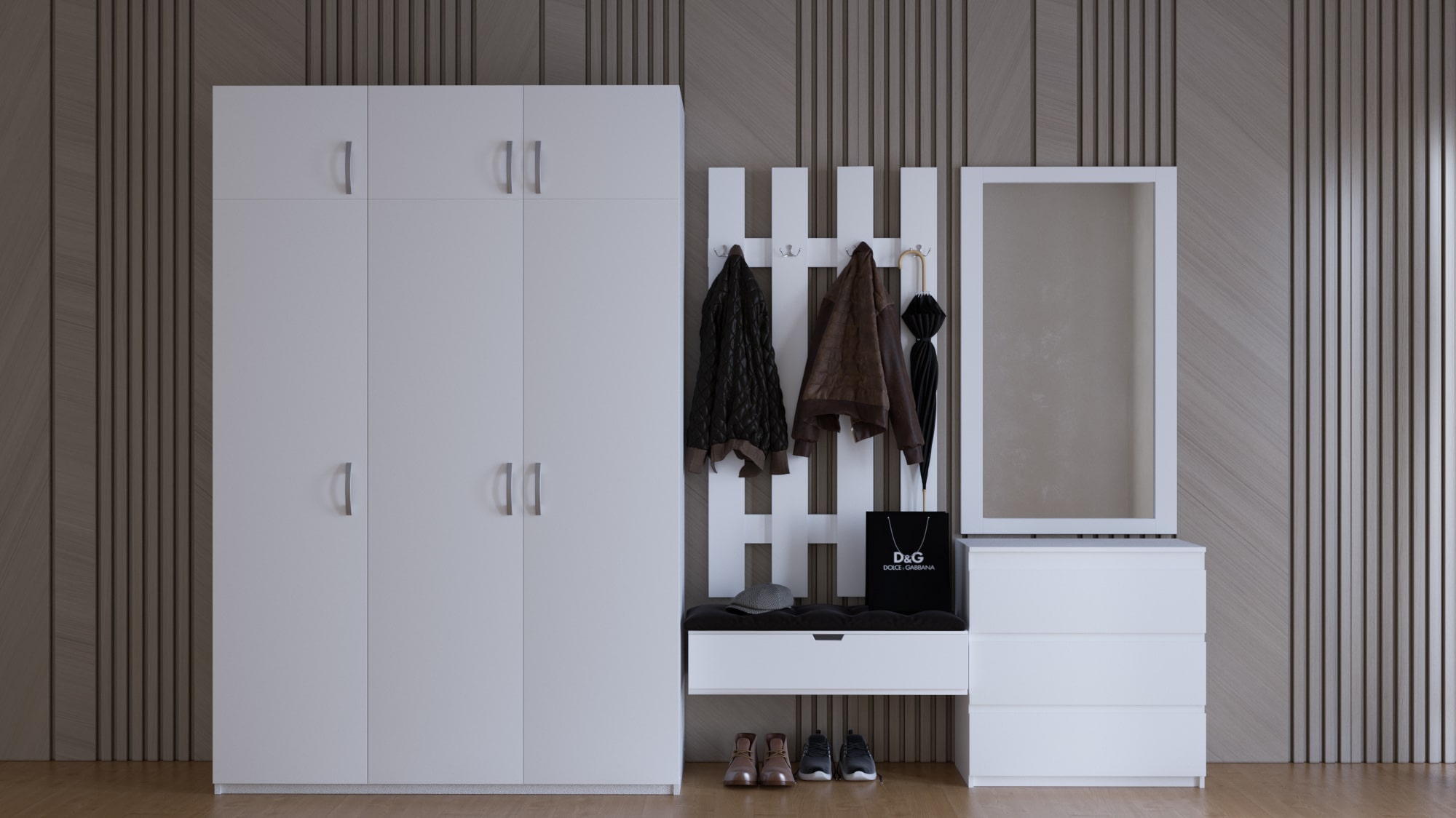 Особенностью шкафа является наличие штанги для вешалок, что позволяет удобно хранить верхнюю одежду и аксессуары.