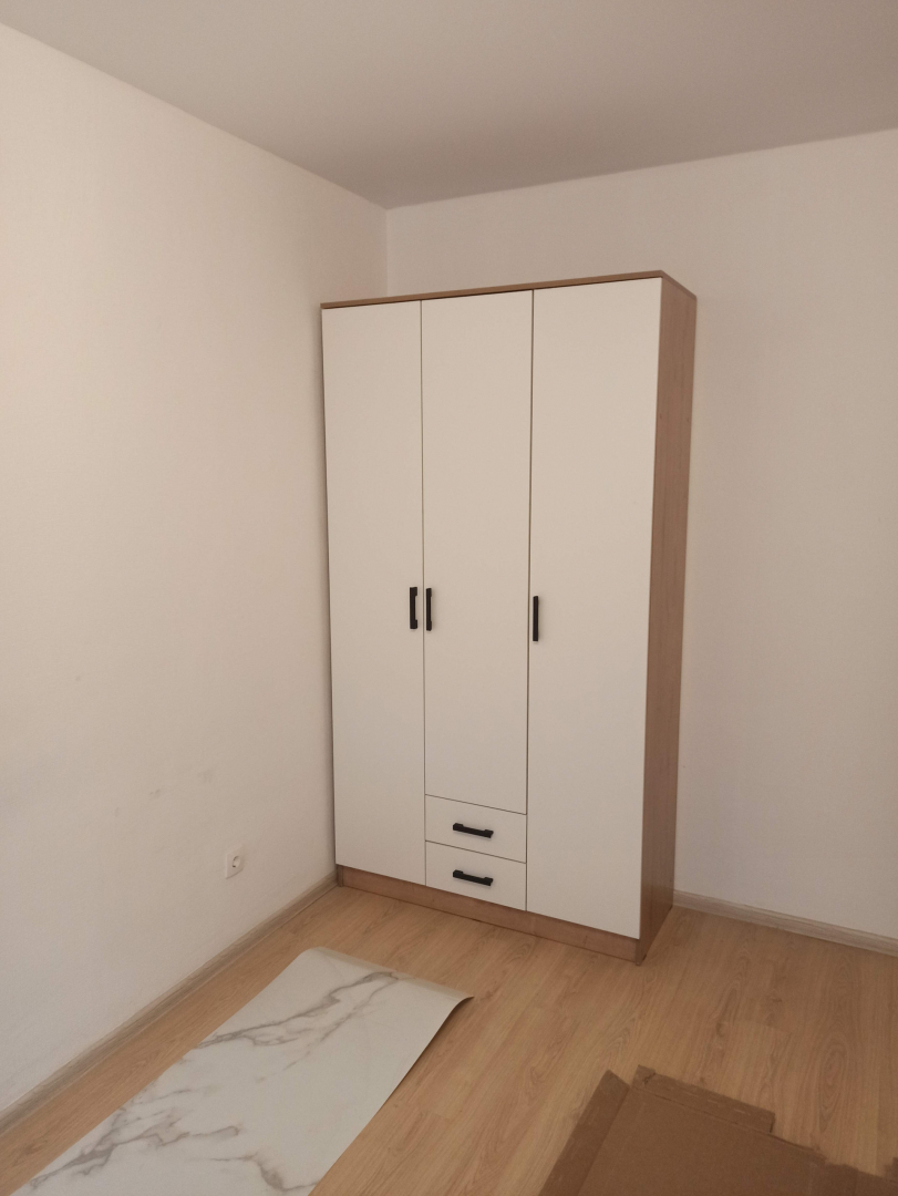 Шкаф оснащен тремя распашными дверцами, за которыми находятся пять полок. Это позволяет удобно разместить длинные платья, зимнюю одежду и другие вещи. Внутри также предусмотрена штанга для вешалок, что делает шкаф еще более вместительным.