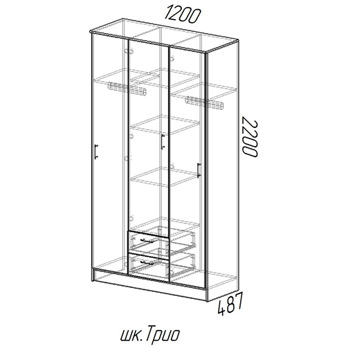 Шкаф оснащен тремя распашными дверцами, за которыми находятся пять полок. Это позволяет удобно разместить длинные платья, зимнюю одежду и другие вещи. Внутри также предусмотрена штанга для вешалок, что делает шкаф еще более вместительным.