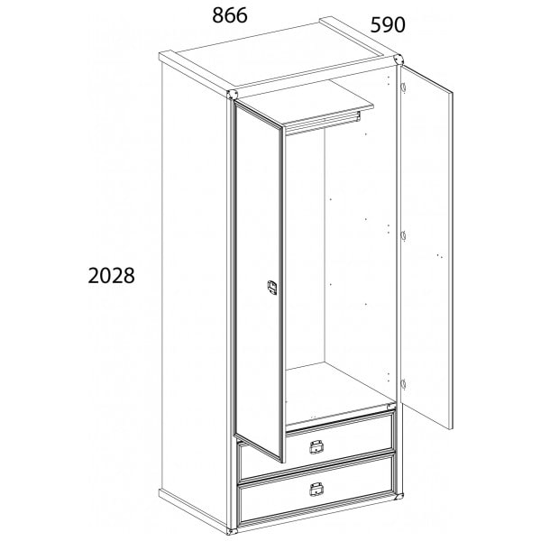 Шкаф 2DG2S MAGELLAN займёт центральное место в интерьере не только спальни, но и молодёжной комнаты (как для девушек, так и юношей). Шкаф 2DG2S имеет прямую конструкцию. Конструкция элемента представляет собой одно гардеробное отделение с нишей за глухими дверями (2D), два выдвижных ящика (2S). Двери распашные, крепятся на петли к боковому корпусу изделия.