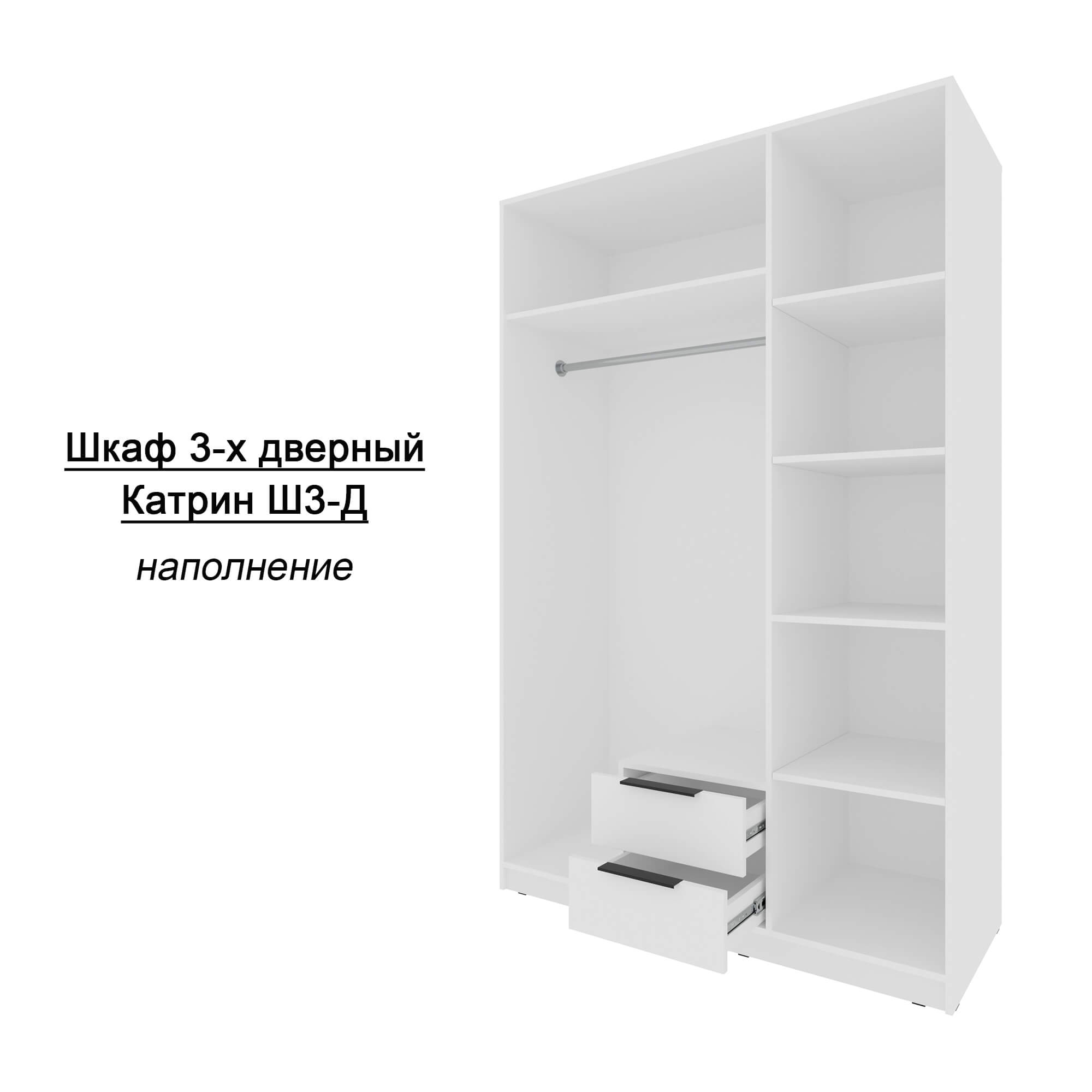 Шкаф 3-х дверный "Катрин" отличается простотой и красотой.  Это отличный вариант для детской комнаты и спальни, такой предмет мебели может стать решением и для просторной прихожей. Внутри вместительного шкафа предусмотрено все необходимое для хранения вещей: рейлинг, глубокая верхняя полка, 4 полки в правом отделении.