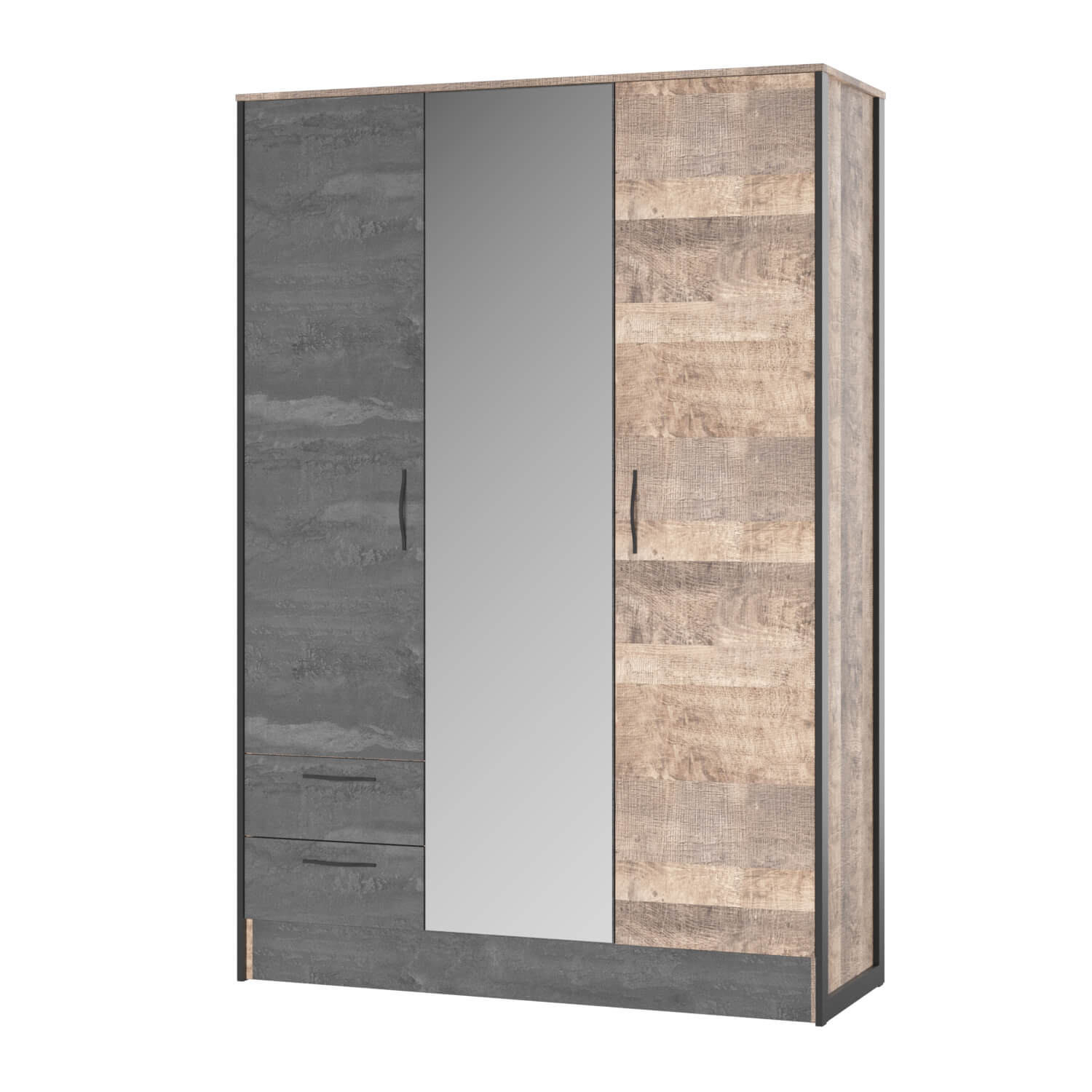 Особенностью шкафа является наличие 3 распашных дверей, 4 полок и 2 ящиков на шариковых направляющих полного выдвижения. Это позволяет удобно разместить одежду, обувь и другие предметы.