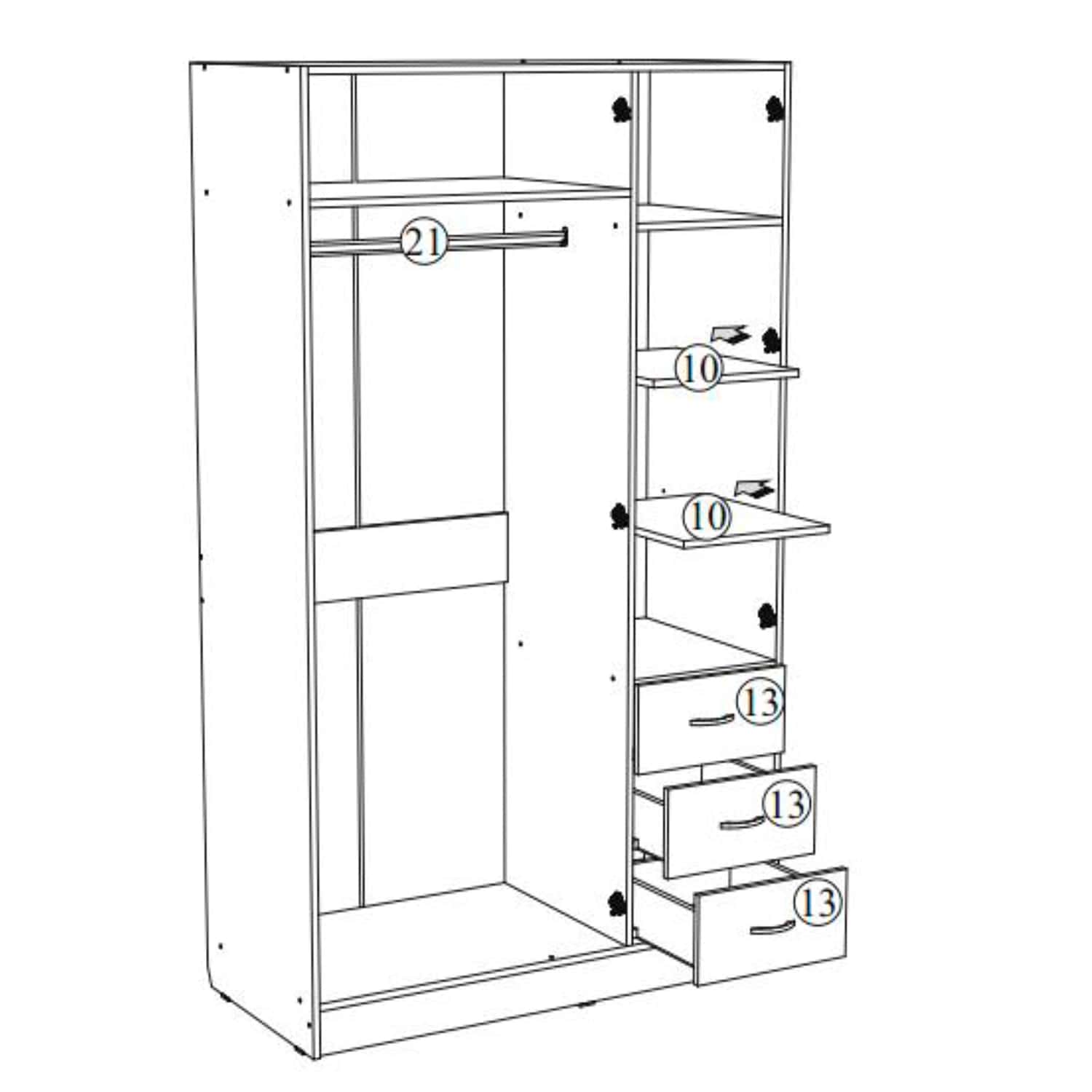 Шкаф распашной «Лофт» — это не только функциональное решение для хранения вещей, но и стильный элемент декора. Три отделения шкафа позволяют удобно организовать пространство комнаты и разместить все необходимые вещи. На полках шкафа можно разместить сложенную одежду, а на штанге — верхнюю одежду. В трех вместительных выдвижных ящиках можно хранить мелкие вещи. Регулируемые скрытые под цоколем опоры придают устойчивость всей конструкции шкафа.