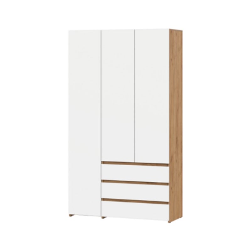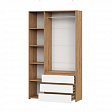 Шкаф трехстворчатый c распашными створками и с тремя выкатными ящиками на шариковых направляющих. Над ящиками центральный отсек для хранения со штангой. За левой створкой расположены четыре полки. Створка открывается при помощи толкателя. Фасады накладные.