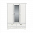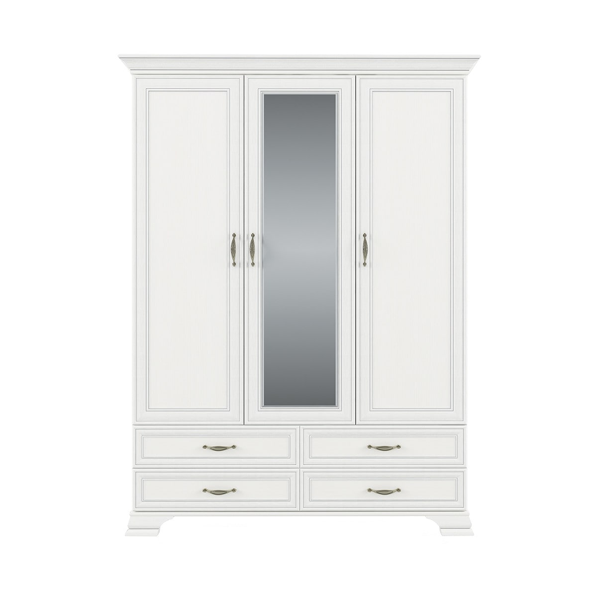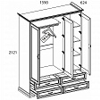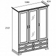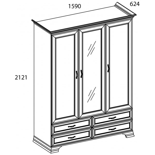 Шкаф Тиффани 3D4S для спальни. Имеет три двери (3D), дополнительную комодную секцию – четыре выдвижных ящика (4S). Шкаф 3D4S прямой. Конструкция элемента представляет собой одно гардеробное отделение для одежды с одной штангой и вместительной нишей для головных уборов и других вещей за глухими дверями (на средней двери снаружи закреплено зеркало), одно отделение с полками для белья, одежды и других вещей за глухой дверью. Дверцы распашные, крепятся на петли к боковому корпусу и внутренней перегородке.