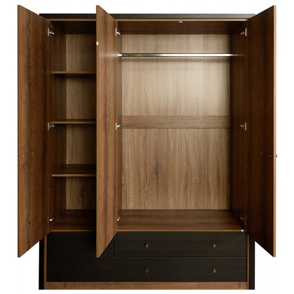 Шкаф JAGGER 3DG2S Z – это смелое и оригинальное решение для интерьера спальни в современном стиле. Контрастное сочетание текстур – дуб Монастырский и чёрный – добавляет элементу неординарный характер, а также один оттенок подчёркивает уникальность другого. Шкаф JAGGER 3DG2S Z имеет прямую конструкцию. Конструкция элемента представляет одно гардеробное отделение со штангой за двумя глухими дверями, одно отделение с полками за глухой дверью, два выдвижных ящика (2S). Двери распашные, крепятся на петли к боковому корпусу и внутренней перегородке. На средней двери (снаружи) крепится зеркало (Z). В изделии используется декоративная накладка в чёрном цвете.