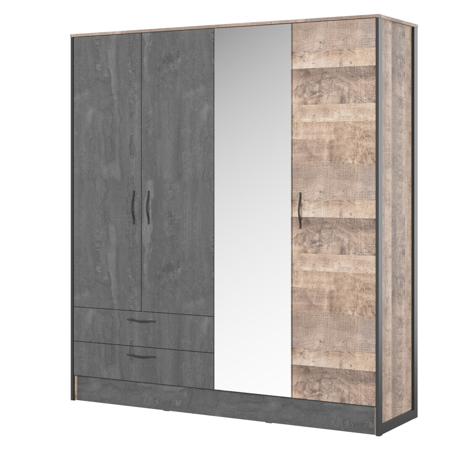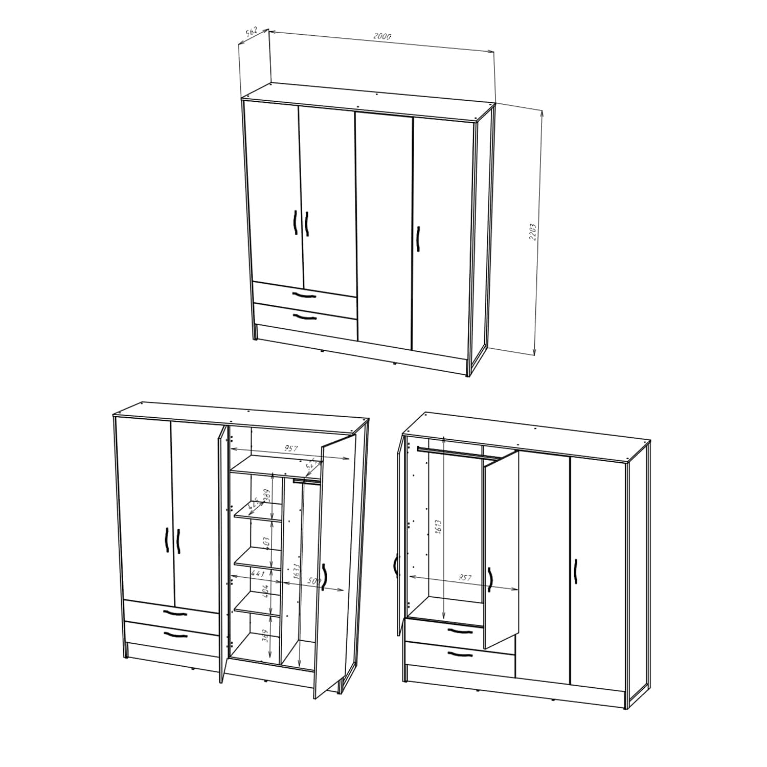 Шкаф оснащен четырьмя распашными дверями, каждая из которых оснащена доводчиком для плавного и бесшумного закрывания. Внутри шкафа расположены четыре полки и два ящика на шариковых направляющих полного выдвижения, что обеспечивает удобство использования.