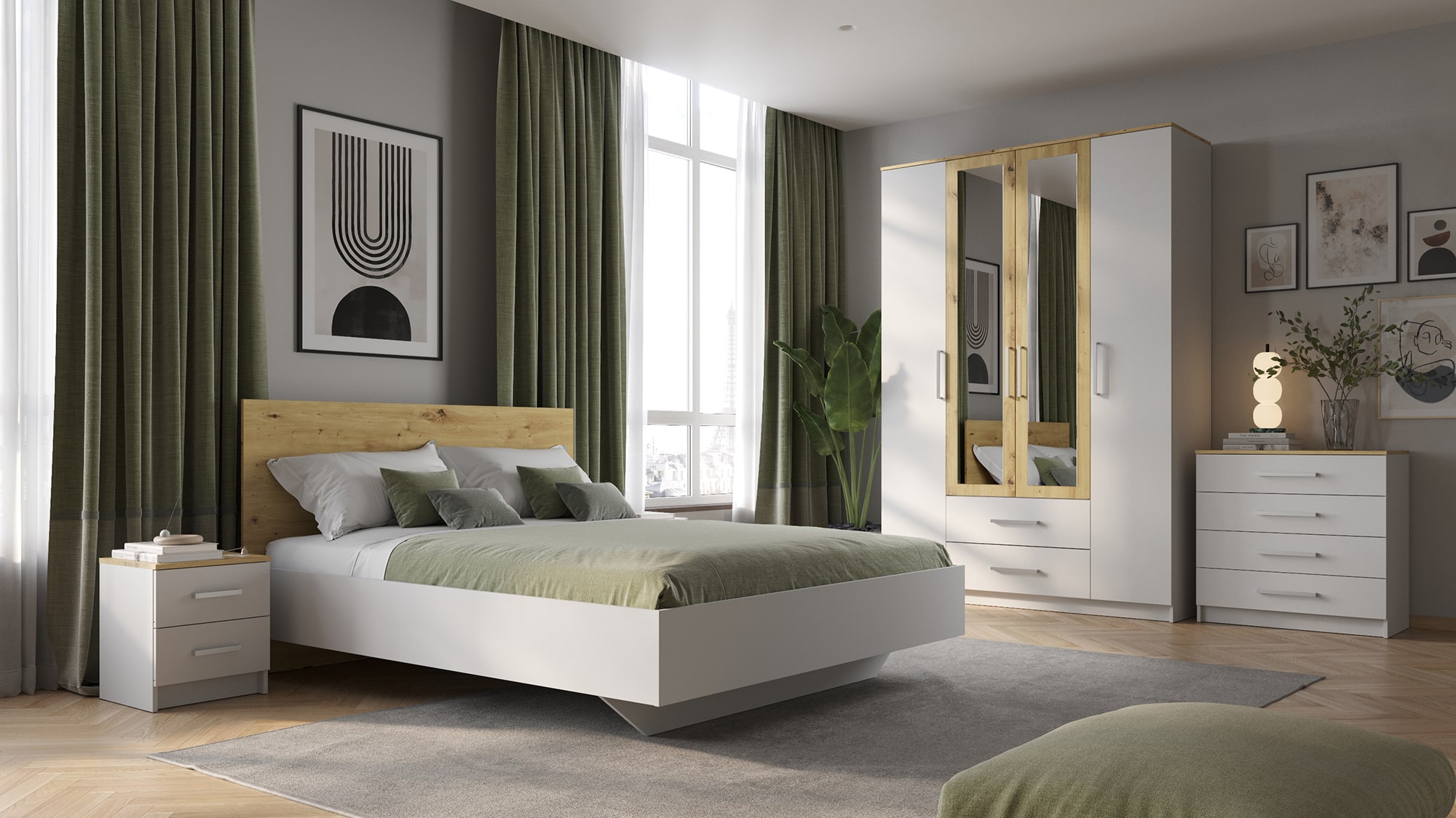 За боковой правой дверью шкафа находятся полки, которые подойдут для хранения сложенной одежды, нижнего и постельного белья, а также различных аксессуаров и коробок с обувью. Два выдвижных ящика обеспечивают дополнительное пространство для хранения.