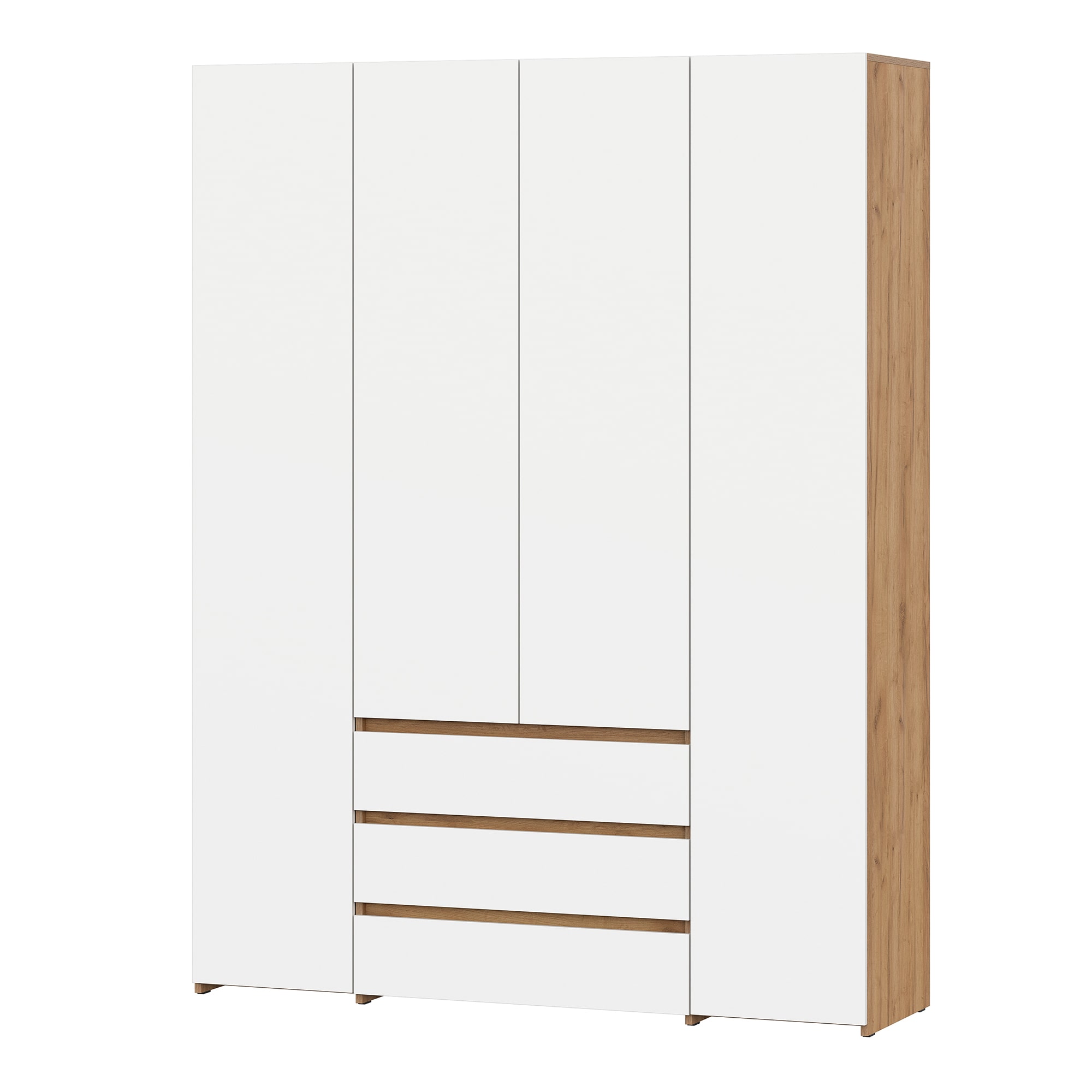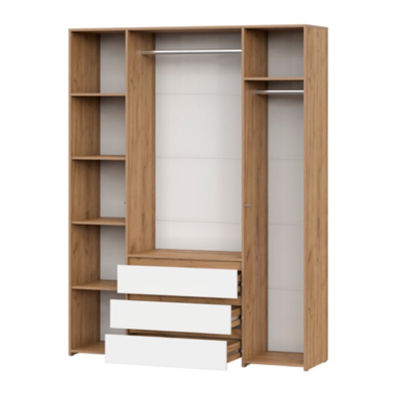 Шкаф четырехстворчатый c распашными створками и с тремя выкатными ящиками на шариковых направляющих. Над ящиками центральный отсек для хранения со штангой. За левой створкой расположены четыре полки. За правой створкой расположена штанга металлическая и полка. Створка открывается при помощи толкателя. Фасады накладные.