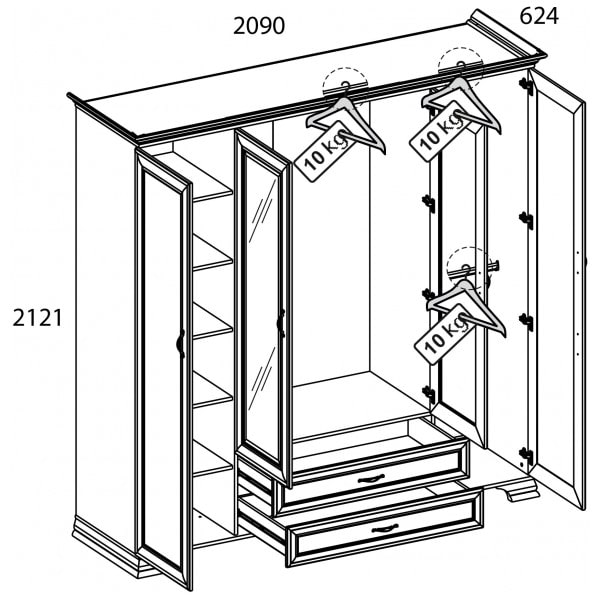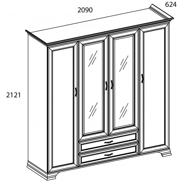 Шкаф Тиффани 4D2S – не только элегантный и роскошный элемент спальни, но и удобный функциональный предмет мебели в интерьере. Шкаф 4D2S имеет четыре двери (4D), дополнительную комодную секцию – два выдвижных ящика (2S). Шкаф Тиффани 4D2S прямой. Конструкция элемента представляет собой одно гардеробное отделение с двумя штангами за глухой дверью, одно (большое) гардеробное отделение с одной штангой для предметов верхней одежды и других вещей за глухими дверями (снаружи закреплены зеркала), отделение с глубокими полками для хранения белья и других вещей за глухой дверью. Дверцы распашные, крепятся на петли к боковому корпусу и внутренним перегородкам.