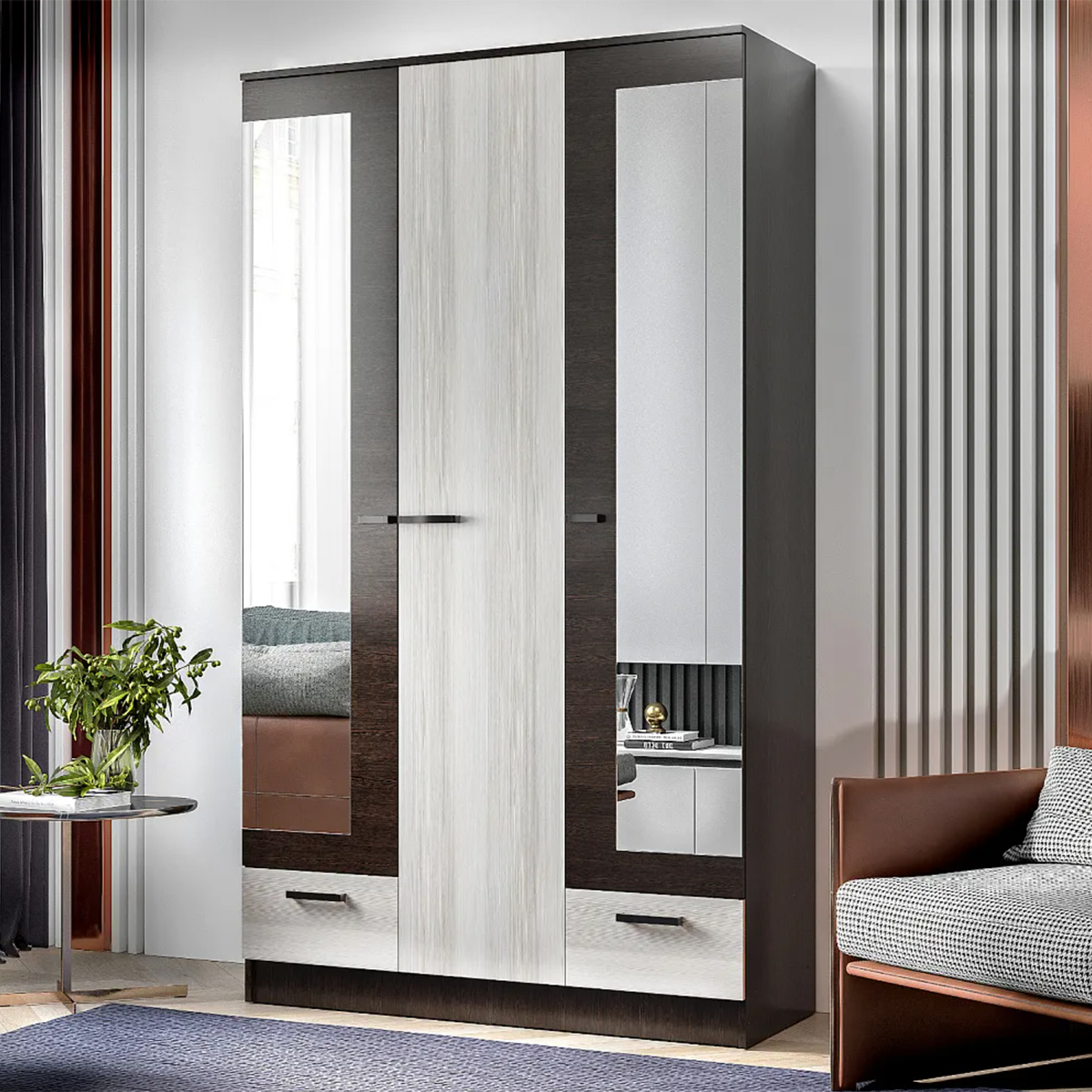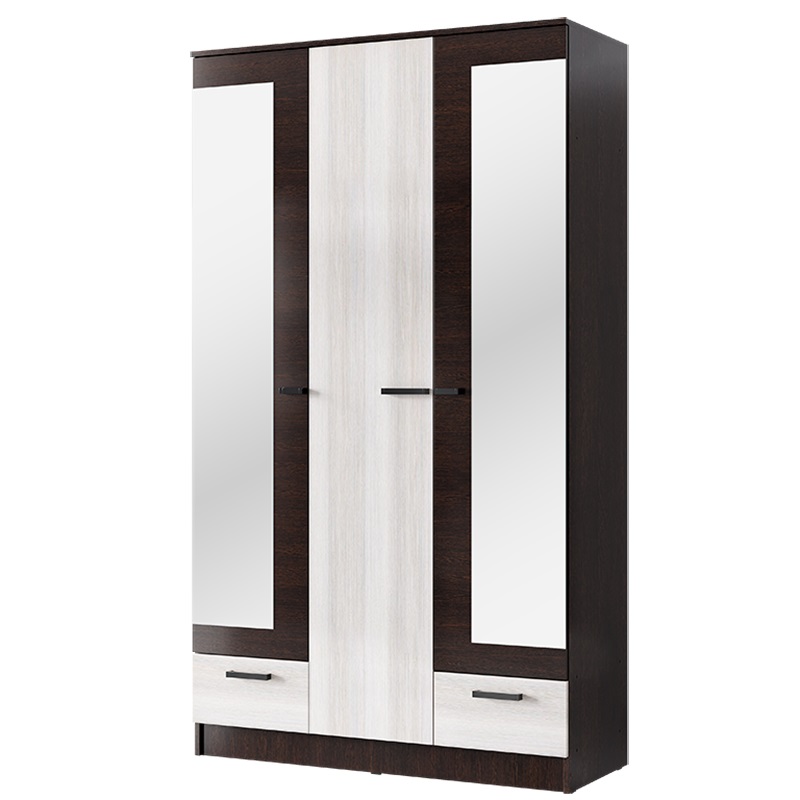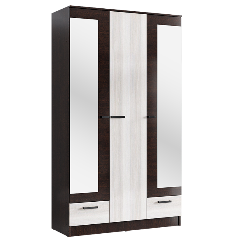 Три распашные двери шкафа обеспечивают удобное размещение предметов гардероба, а внутри шкафа находятся четыре полки и два ящика для дополнительного пространства хранения.