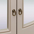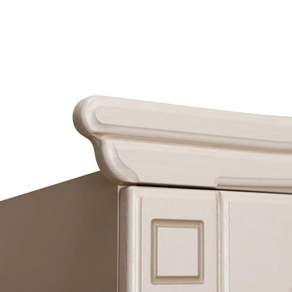 Фасады мебели декорированы элегантной фрезеровкой с эффектом патины и медальоном, на котором изображены розы. Для удобства использования дверцы и ящики оснащены темными металлическими ручками, имитирующими ковку.