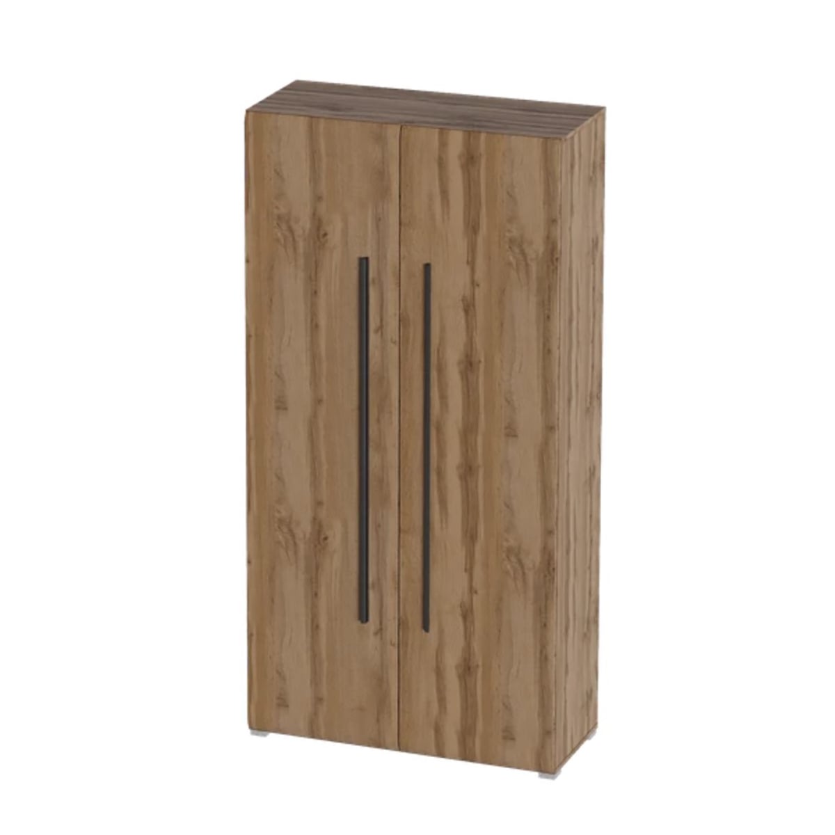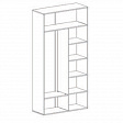 Корпус шкафа изготовлен из ЛДСП, фасады с закругленными линиями - из МДФ. Стиль изделия подчеркивают черные металлические ручки. Внутреннее пространство шкафа разделено на верхнюю широкую полку по горизонтали и на два отделения по вертикали: платяное и для хранения вещей. В платяном отделении находится одна поперечная штанга и одна стационарная полка. В отделении для хранения вещей установлено четыре съёмные полки.