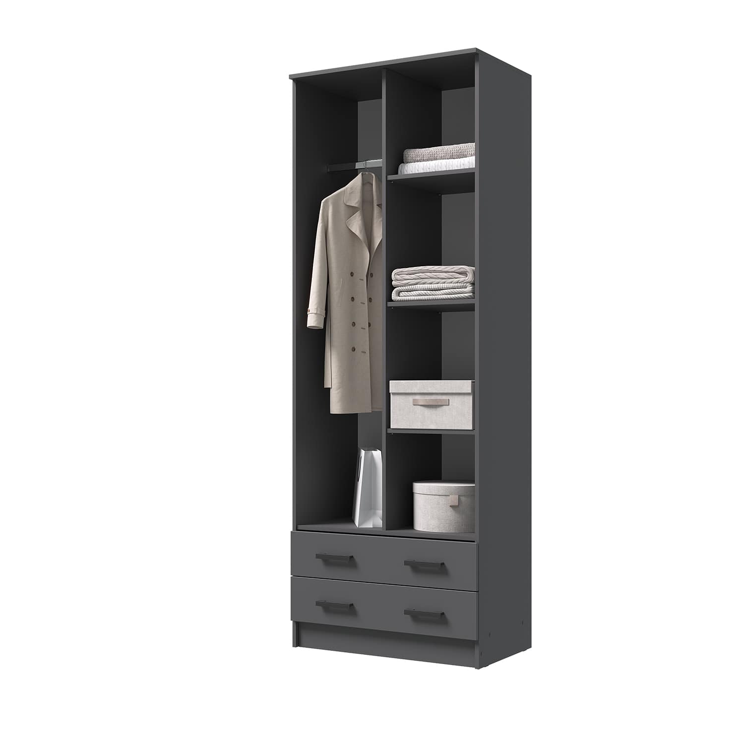 Шкаф оснащен двумя распашными дверями, за которыми находятся три полки и штанга. Это позволяет удобно разместить одежду, аксессуары и другие предметы, экономя пространство в комнате.