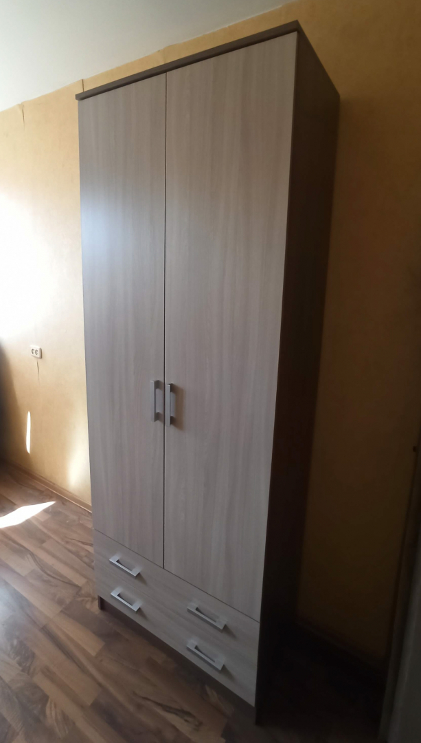 Шкаф оснащен двумя распашными дверями, за которыми скрываются три полки и штанга. Это позволяет удобно разместить большое количество вещей, экономя пространство в комнате.