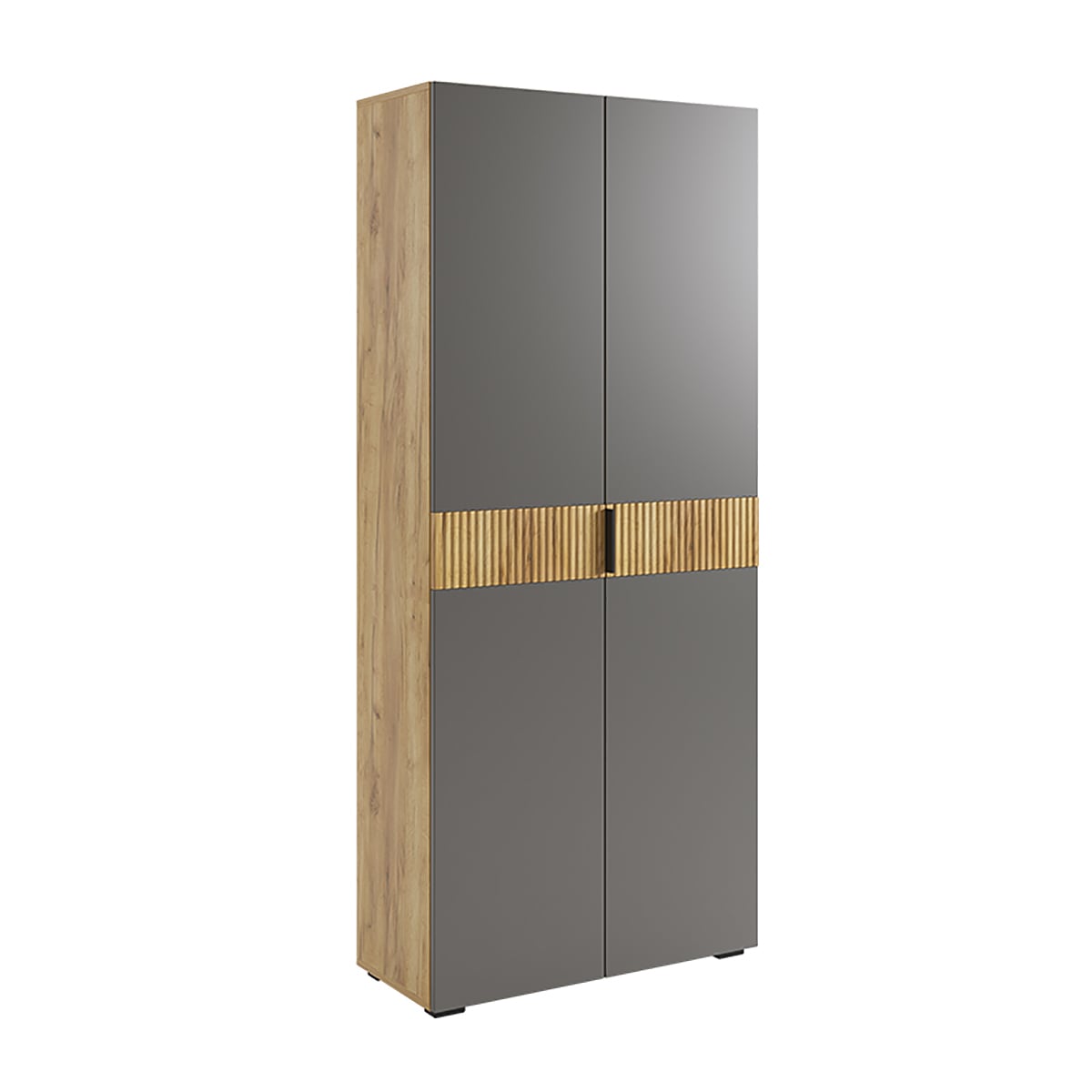 Шкаф оснащен двумя распашными дверями, что обеспечивает удобный доступ к содержимому. Внутри шкафа предусмотрено 6 секций, включая выдвижную штангу для вешалок и 4 полки. Это позволяет разместить все необходимые вещи и аксессуары.