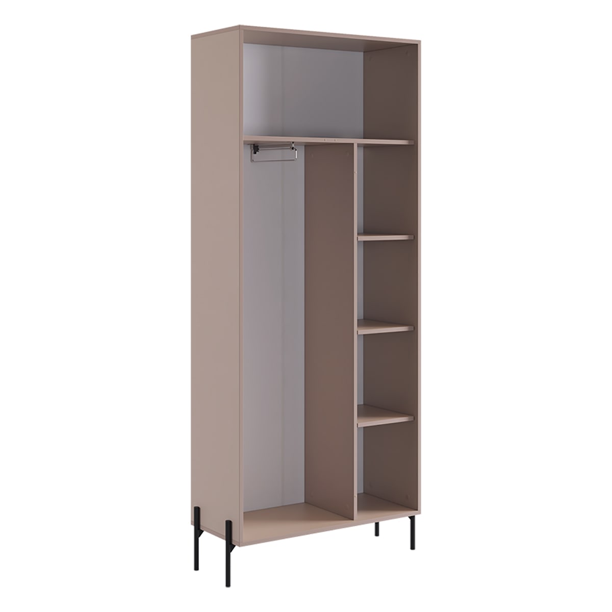Шкаф "Доминика" оснащен глухими фасадами, скрывающими за собой просторное внутреннее пространство. На одной стороне шкафа находится штанга для одежды, обеспечивая удобное место для хранения одежды на вешалках.
