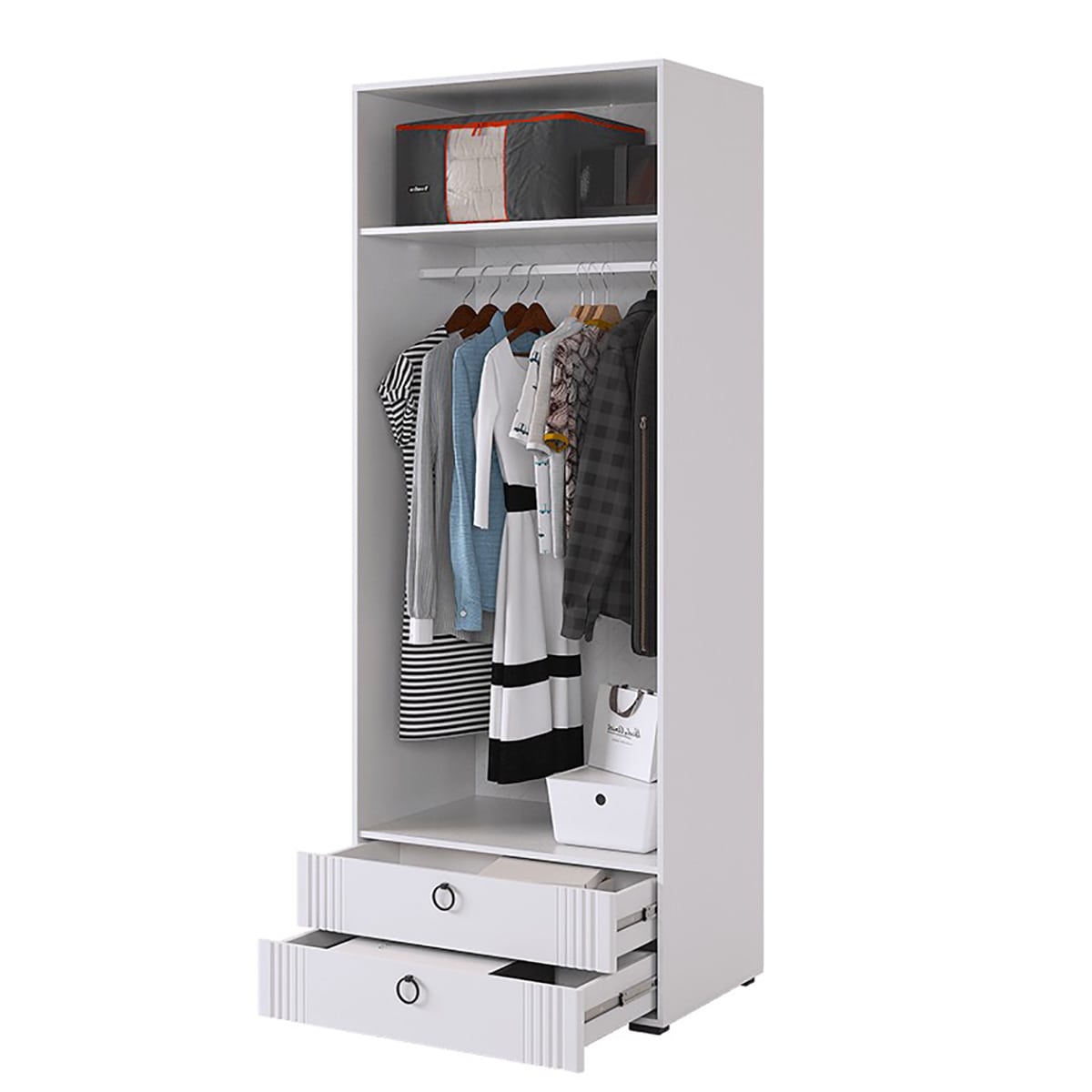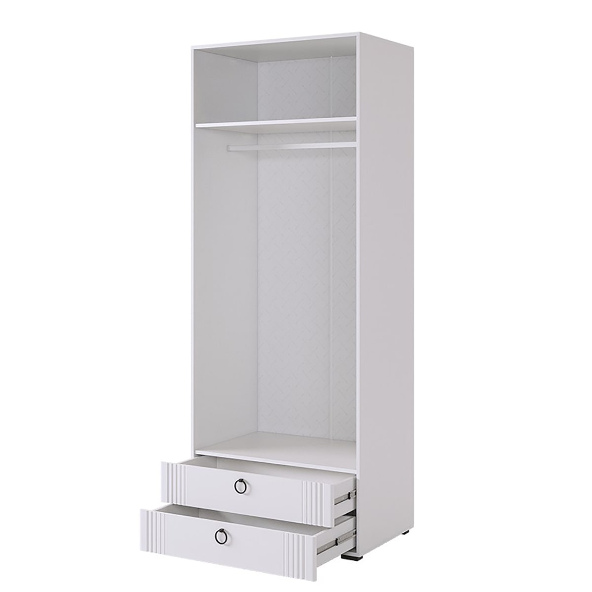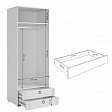 - Внутреннее наполнение включает штангу для одежды, полки и два удобных ящика с шариковыми направляющими.