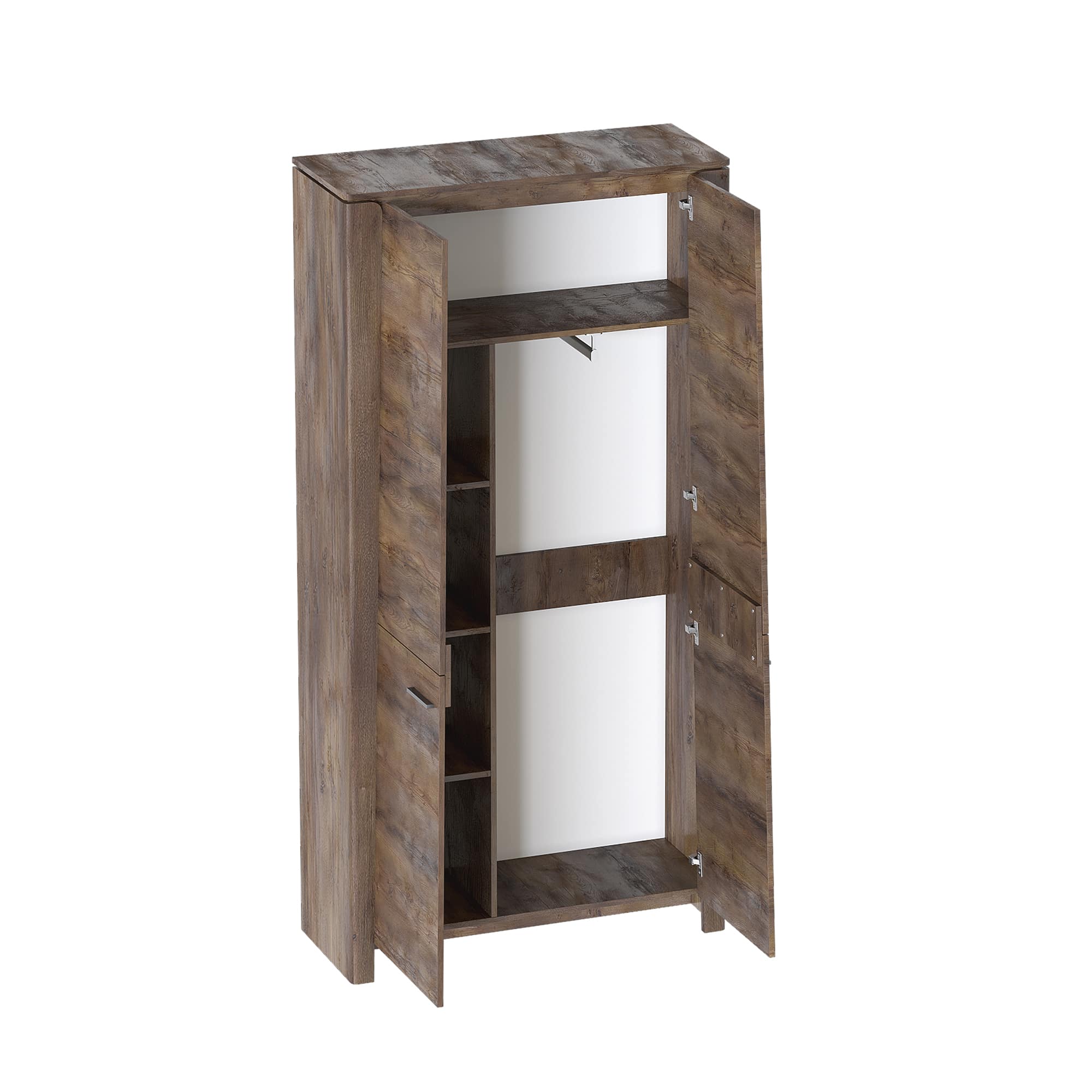 Внутреннее пространство шкафа разделено полкой на секцию с продольной стальной трубой для вешалок и верхний отсек для хранения постельного белья. Фасады изготовлены из МДФ, который обладает водоотталкивающими свойствами, экологической безопасностью, гипоаллергенностью, прочностью и долговечностью.